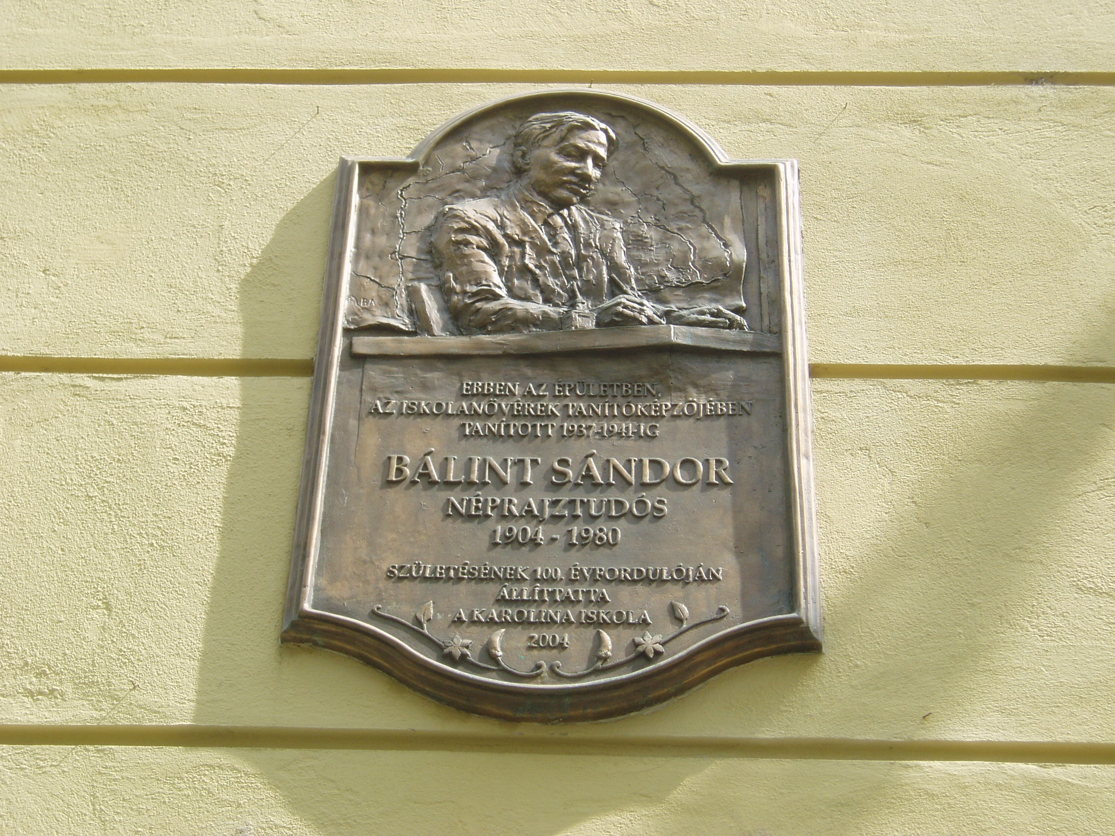 Nyilvános 1066 | 1552 | Szeged, Szentháromság utca 70-76. | Az egyházi Karolina Iskola épületében az elmúlt rendszer idején a Juhász Gyula Tanárképző Főiskola Ének–zene Tanszéke működött. Itt tanított Kardos Pál Liszt–díjas karnagy, aki 1961–1972 között a főiskola leánykarát is vezette. Kardos Pál tanári személyisége, művészi igényessége meghatározóvá vált növendékei és kollégái körében. Emléktábláját 2002. március 22-én avatták fel az épület falán. Az épületen portrédomborműves emléktábla idézi Bálint Sándor néprajztudós (1904–1980), „a legszögedibb szögedi” alakját, aki 1937 és 1941 között az itt működő Iskolanővérek tanítóképzőjének tanára volt. A fénykép 2007 júliusában készült. Felh. irod.: Tizenkét év kőben és ércben. Szeged, Önkormányzat, 2002 |