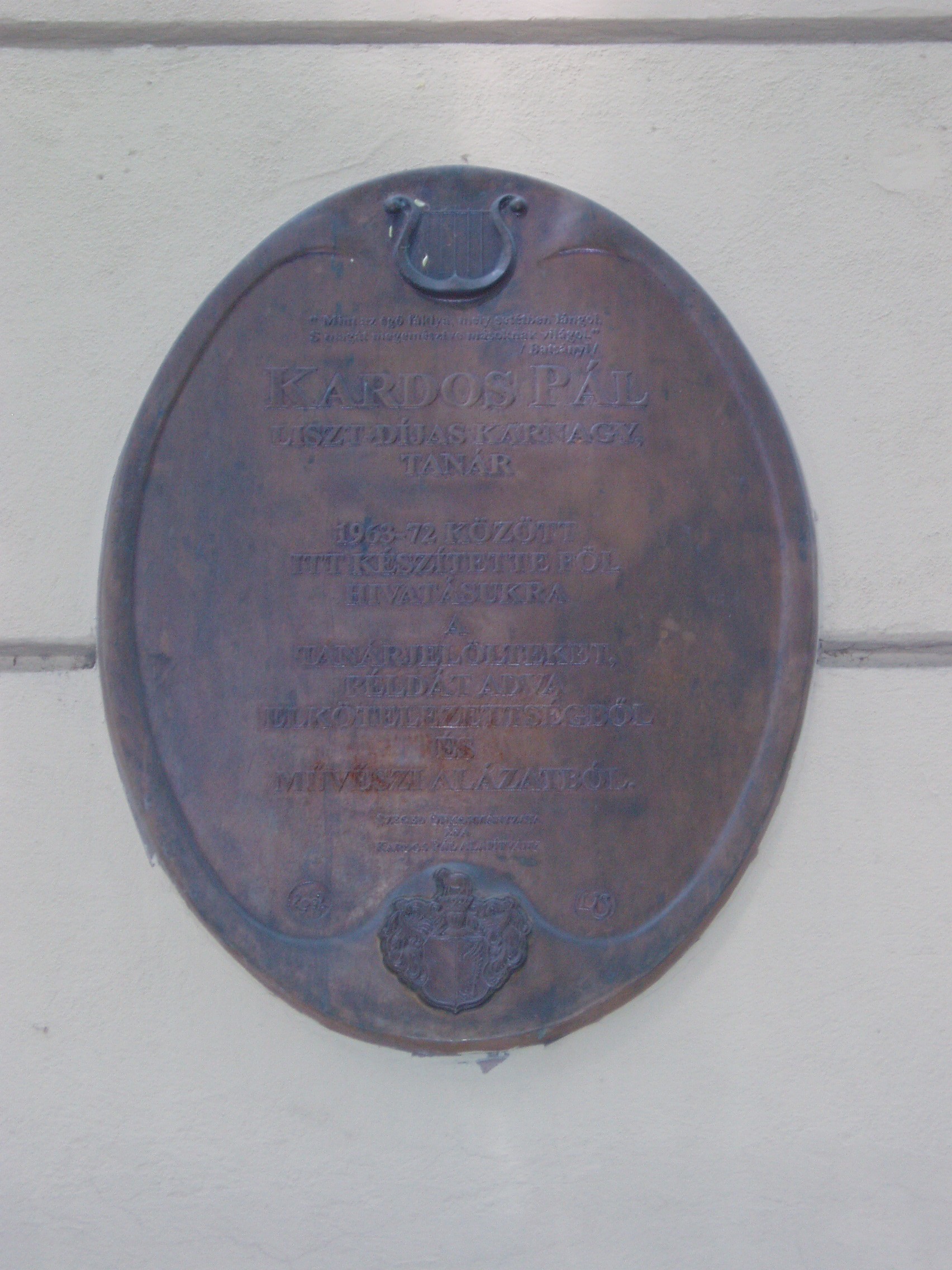 Nyilvános 1123 | 1751 | Szeged, Szentháromság utca 70-76. | Az egyházi Karolina Iskola épületében az elmúlt rendszer idején a Juhász Gyula Tanárképző Főiskola Ének–zene Tanszéke működött. Itt tanított Kardos Pál Liszt–díjas karnagy, aki 1961–1972 között a főiskola leánykarát is vezette. Kardos Pál tanári személyisége, művészi igényessége meghatározóvá vált növendékei és kollégái körében. Emléktábláját 2002. március 22-én avatták fel az épület falán. Az épületen portrédomborműves emléktábla idézi Bálint Sándor néprajztudós (1904–1980), „a legszögedibb szögedi” alakját, aki 1937 és 1941 között az itt működő Iskolanővérek tanítóképzőjének tanára volt. A fénykép 2007 júliusában készült. Felh. irod.: Tizenkét év kőben és ércben. Szeged, Önkormányzat, 2002 |