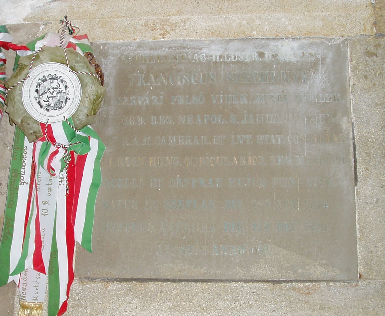 Nyilvános 1239 | 2379 | Nagycenk, Mauzóleum: Széchényi Ferenc sírja | A Széchényi család nyughelyét a temető létesítésével egyidőben Széchényi Ferenc építtette 1778-ban. A barokk stílusú sírkápolnát 1806-10 között klasszicista előtérrel bővítették. A téglalap alakú előcsarnok kazettás mennyezetét ion oszlopok tartják. Az ovális alaprajzú kápolnát kupola fedi, több kutató véleménye szerint Dorffmeister István freskóival. Innen jutunk a kriptába, a család számos jeles tagjának végső nyughelyére. A képen a Nemzeti Múzeumot megalapító Széchényi Ferenc sírjának záróköve látható, latin felirattal. A fénykép 2005 júliusában készült. Felh. irod.: Látnivalók Győr-Moson-Sopron megyében. Miskolc, Well-PRess, 2000 |