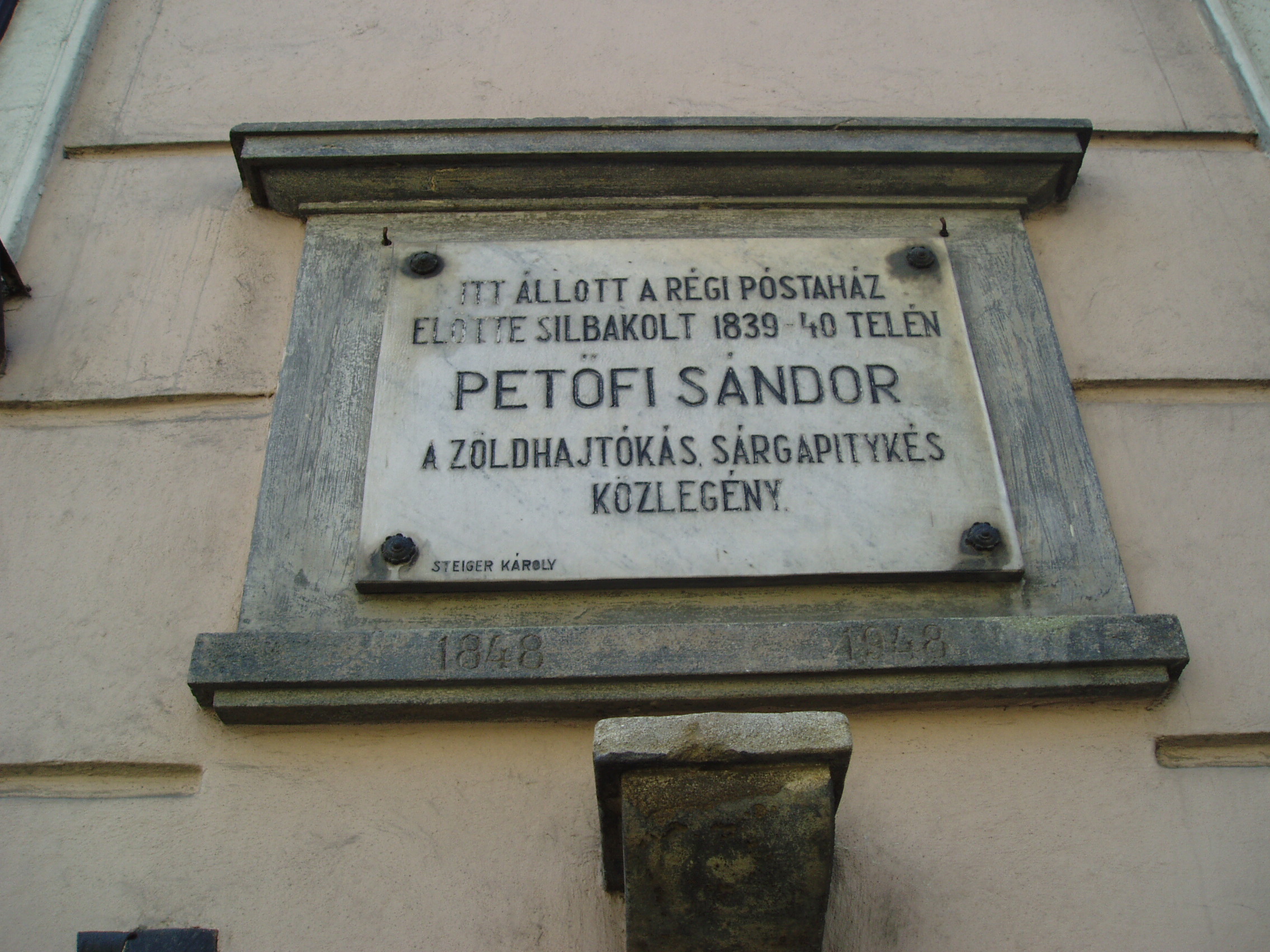 Nyilvános 1139 | 1877 | Sopron, Széchenyi tér 14. | Az épületen Petőfi Sándor emléktáblája olvasható azon a helyen, ahol a régi postaház előtt katona korában őrségben szokott állni. Petőfi 1839. szeptember 6-án hirtelen elhatározással belépett a báró goldnerfalvi Gollner Alajos tulajdonában lévő gyalogezredbe, és hat évi szerződést írt alá. A költő a zöldhajtókás, sárga pitykés, frakkszabású egyenruhát rövid ideig hordta. Betegsége miatt 1841. februárban felmentették a szolgálat alól, és obsittal elbocsátották, majd 1841. március elején elhagyta a várost. Ma e hely közelében szobra is áll. A fénykép 2006 áprilisában készült. Felh. irod.: Czellár Katalin: Sopron. Bp. Panoráma, 1988 |