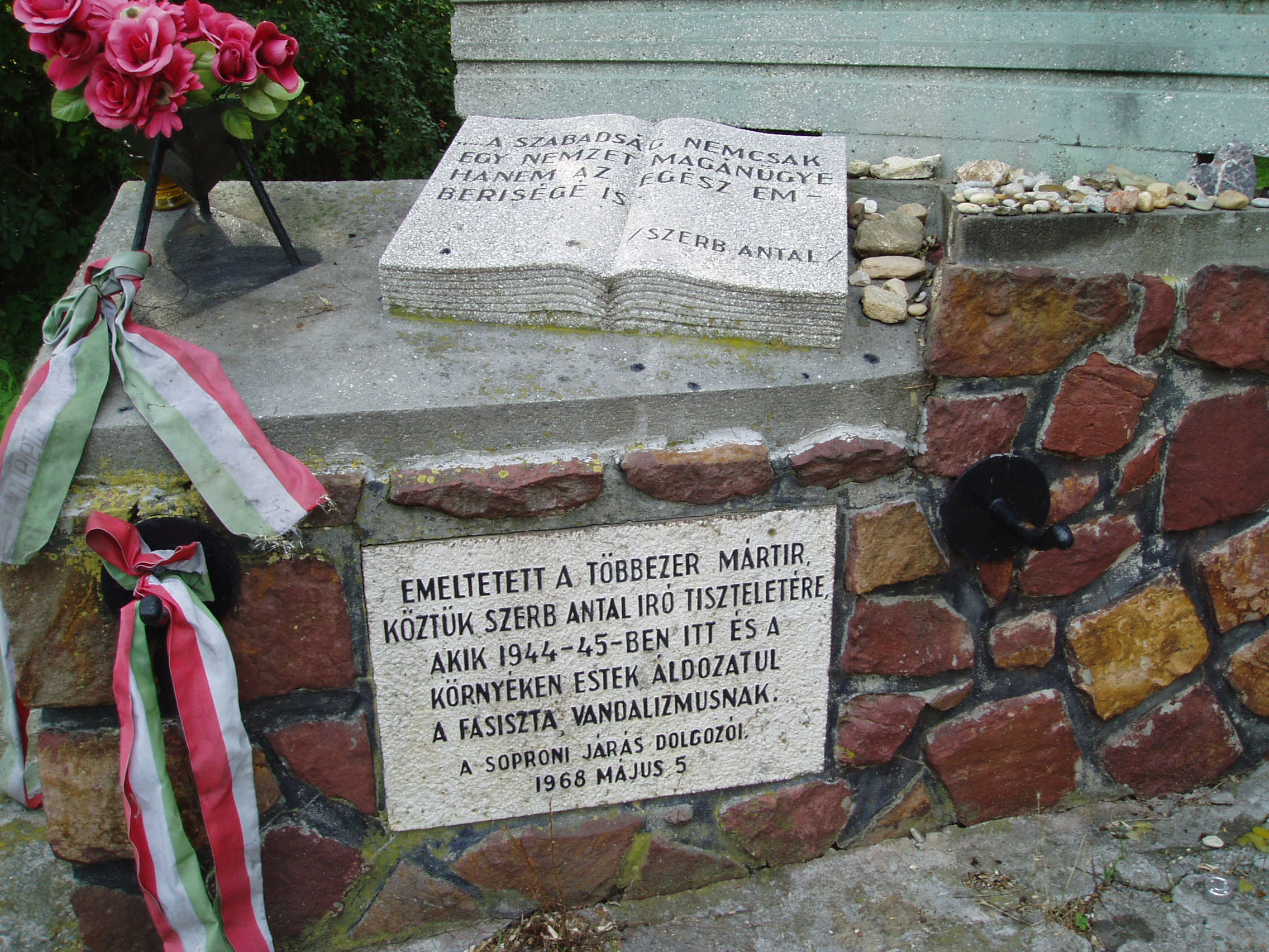 Nyilvános 1684 | 4058 | Balf, Temető: Mártíremlékmű | A II. világháborúban munkaszolgálatos tábort rendeztek be Balfon, ahol mintegy 2000 ember lelte halálát, közöttük Szerb Antal író, irodalomtörténész és Sárközi György író, költő. A Fodor János szobrászművész által készített emlékművet 1968-ban emelték az áldozatok tiszteletére a balfi régi temető kapujának közelében. Felirata Szerb Antal jelmondata: "A szabadság nemcsak egy nemzet magánügye, hanem az egész emberiségé." A fénykép 2005. szeptemberében készült. Felh. irod.: Látnivalók Győr-Moson-Sopron megyében. Miskolc, Well-PRess, 2000 |