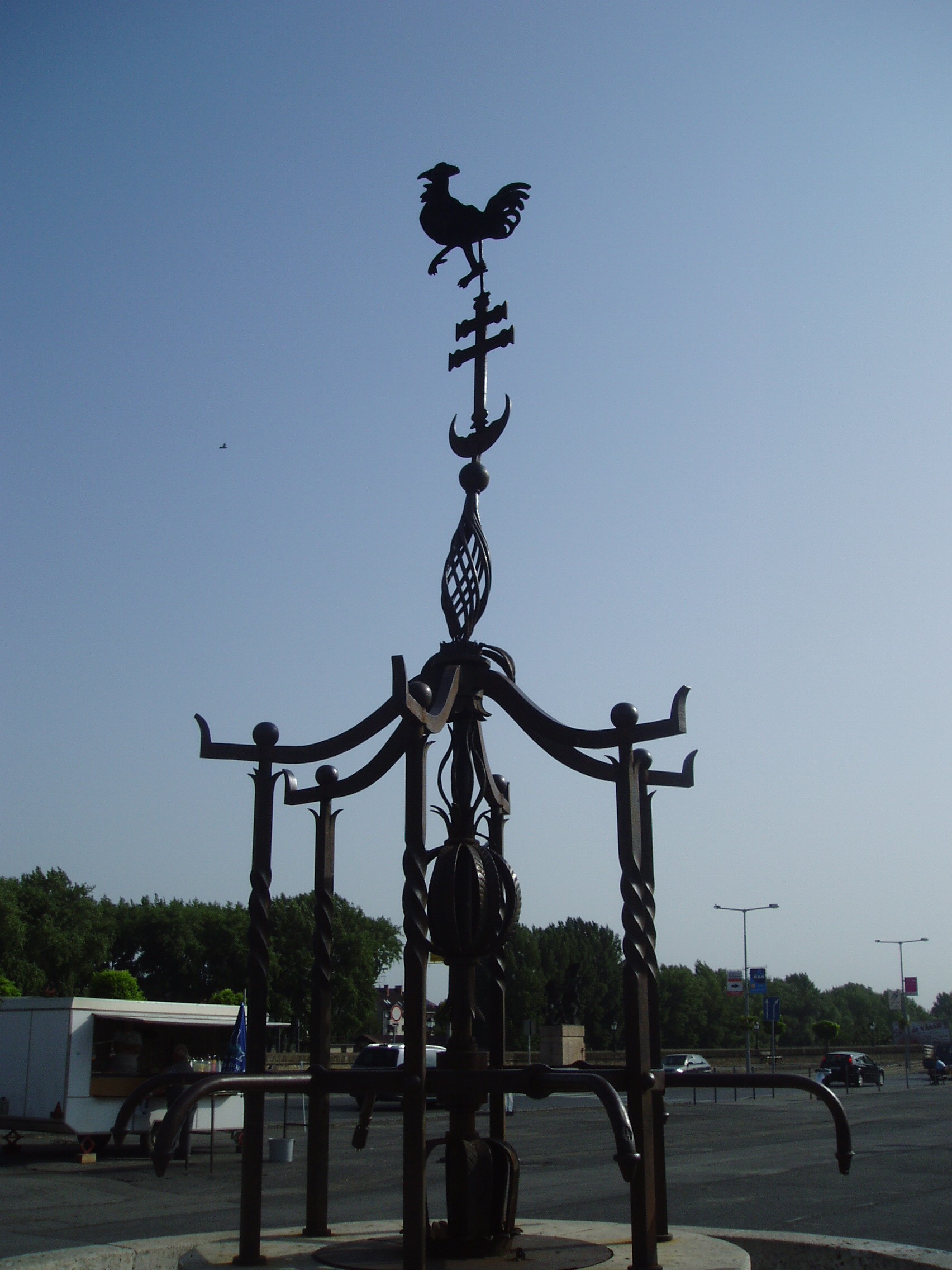 Nyilvános 1198 | 4146 | Győr, Dunakapu tér: Vaskakas | A Dunakapu tér közepe táján lévő díszkút tetejét a győri vaskakas másolata őrzi. A város jelképének is tartott madár eredeti példánya, amely ma a múzeumban látható, voltaképpen egy vörösréz lemezből kivágott szélkakas, amely a már nem létező Dunakapu építményét koronázta. Hozzá Győr várának a töröktől való 1598-as visszafoglalásához kapcsolódó legenda fűződik, amelynek forrása egy korabeli, Bécsben megjelent népének. E szerint a török dölyfösségében a Vízi-kapura aranyozott kakast helyezett el, és azt mondta, akkor űzik ki őket Győrből, amikor ez a kakas kukorékolni fog. A hagyomány szerint a vár visszafoglalásakor az érckakas az erős szélviharban valóban megszólalt... A felvétel 2008 május végén készült. Felh. irod.: Cziglényi László: Győr. Bp. Panoráma, 1981 |
