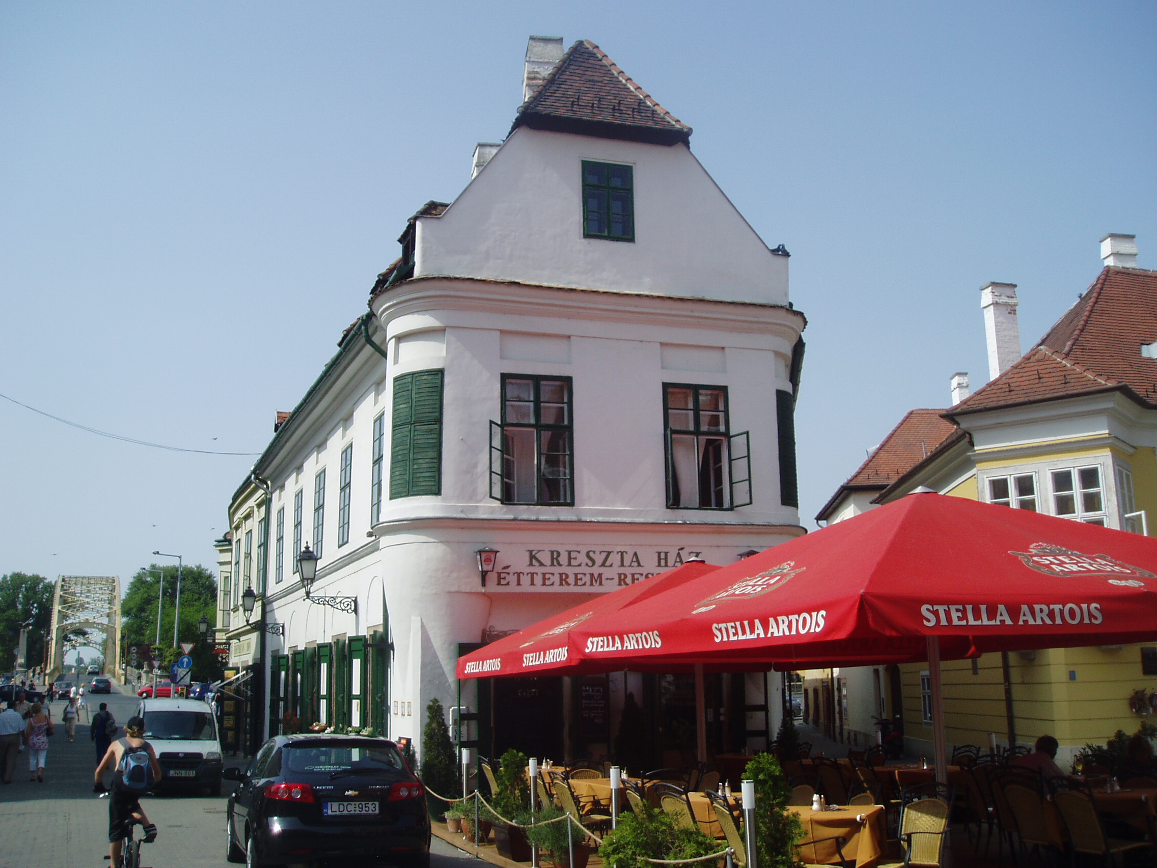 Nyilvános 1086 | 1606 | Győr, Jedlik Ányos utca 3. Kreszta-ház | Az épületet, bár a XVIII. század elején épült, sokan középkori eredetűnek hiszik kontytetős oromzata és kiugró emeleti homlokzata miatt. Három utcára néző homlokzata klasszicista stílusú. Utolsó tulajdonosa, a Kreszta kereskedőcsalád után kapta ma is használatos nevét. Itt kapott helyet a győri születésű Kovács Margit állandó kiállítása. Az épületbelsőben sajnos nem lehet fényképezni. A felvétel 2008 május végén készült. Felh. irod.: Cziglényi László: Győr. Bp. Panoráma, 1981 |