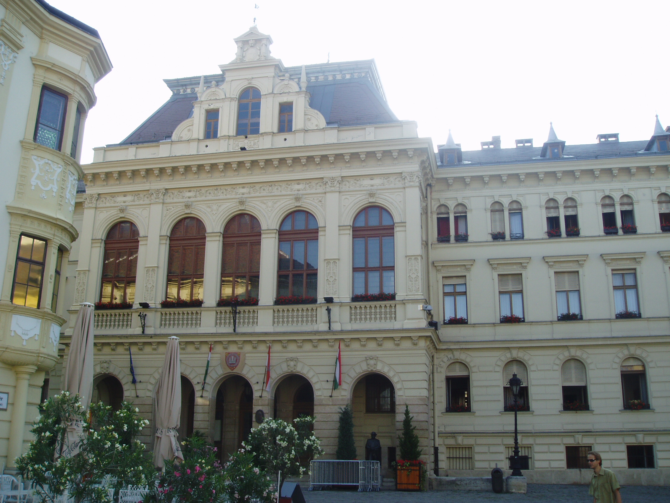 Nyilvános 1068 | 1471 | Sopron, Fő tér 1. Városháza | 1497-től állt ezen a helyen Sopron első számú középülete. Ekkor vásárolta meg és alakíttatta át a város az akkori régi házat. Itt működött a sokoldalú Lackner Kristóf polgármester, aki jeles művészként az épületet kívül és belül festményekkel, feliratokkal díszítette. A mai, eklektikus stílusú városháza az 1890-es évek első felében épült a régi, rossz állapotú középület helyére. Tervezői Hintraeger Mór és fia voltak. A kép 2008 júniusában készült. Felh. irod.: Czellár Katalin: Sopron. 3. jav. kiad. Bp. Panoráma, 2000 |
