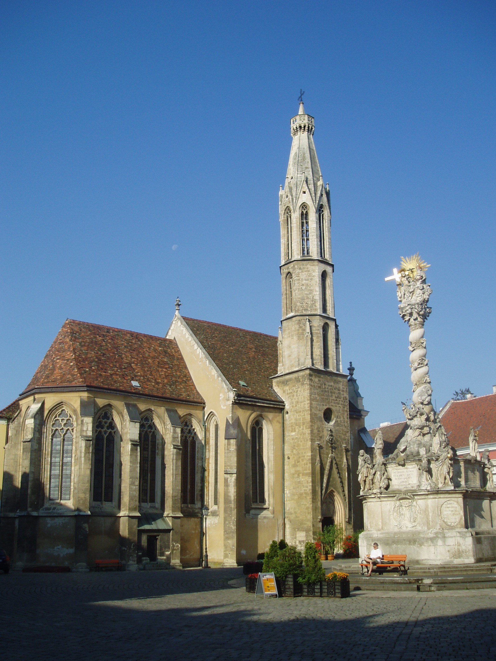 Nyilvános 1012 | 1470 | Sopron, Fő tér: Kecske-templom | A soproni Fő tér ékességét, a gótikus Kecske–templomot és a hozzá tartozó ferences kolostort a XIII. század második felében kezdték építeni. Tornya a XIV. század első negyedében készült el; mai alakja id. Storno Ferenc 1888–1894 között végzett helyreállításának eredménye. Szokatlan nevét a kapuzat felett látható faragott állatfiguráról kapta (a ma látható kecske Storno Ferenc faragványa, az eredeti a Káptalanteremben van), amelyről kiderítették a kutatók, hogy az építtető Gaisel család címerállata volt. Maga a templom faragott kőből épült, háromhajós, északi oldalán toronnyal díszített kora gótikus épület, berendezése a későbbi századokból származó barokk, illetve rokokó stílusú. Déli hajójának közepén áll egy XV. századból származó, márványból készült szószék. Ebbe ágyazták bele azt a fából faragott szószéket, amelyről állítólag Kapisztrán János prédikált a templom előtt a török ellen. A templom többször volt színhelye országos jelentőségű ünnepségeknek, reprezentációs alkalmaknak: 1553 és 1681 között öt alkalommal falai között tartották az országgyűlési ünnepeket; 1625-ben királyt (III. Ferdinánd), 1622-ben és 1681-ben királynét koronáztak benne. 1787-ben feloszlatták a ferences rendet, s az épületegyüttest később a bencések kapták meg. A fénykép 2008 júniusában készült. Felh. irod.: Czellár Katalin: Sopron. 3. jav. kiad. Bp. Panoráma, 2000 Albert Tibor: Sopron–Vas vármegyei útikönyv. Magyar múlt — osztrák–magyar jelen. Kőszeg, Városkapu Kiadó, 2005 |