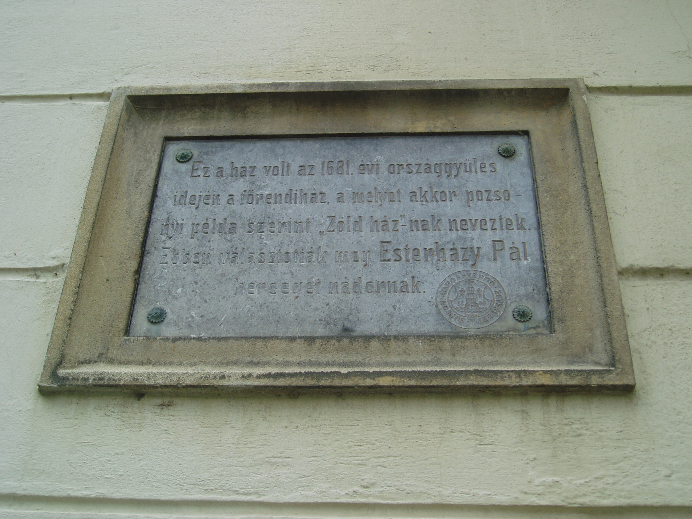 Nyilvános 1344 | 1661 | Sopron, Hátsókapu 2. | Az ún. Caesar–ház hatalmas reneszánsz sarokerkélyével a városkép jellegzetes eleme. Helyén valamikor több kisebb, valószínűleg a XV. században épült lakóház állt. Az 1676-ban Sopron belvárosát sújtó nagy tűzvész után ezek megmaradt részei, valamint a belső városfal maradványainak felhasználásával épült fel e pompás kis városi palota. Dongaboltozatos kapualjában megmaradtak a középkori ülőfülkék. Udvari szárnyának emeletén toszkán oszlopos, köríves árkádsor van. Az udvarból a falszorosban kialakított kertbe juthatunk, ahol látható a római és a ráépült középkori városfal, amelyet ablakokkal áttörve az épület hátsó homlokzataként használtak fel. Két emeleti termében megmaradt az 1700 körül készült, kora barokk ornamentális stukkómennyezet. Az 1681-es országgyűlés idején ebben az épületben ülésezett a főrendiház, ekkor választották Magyarország nádorává Esterházy Pál herceget, aki Harmonia caelestis című kantátasorozatával beírta nevét a magyar zenetörténetbe is. Az eseményt a Soproni Városszépítő Egyesület körpecsétjével ellátott emléktábla örökíti meg az épület homlokzatán. A fénykép 2008 júniusában készült. Felh. irod.: Czellár Katalin: Sopron. 3. jav. kiad. Bp. Panoráma, 2000 |