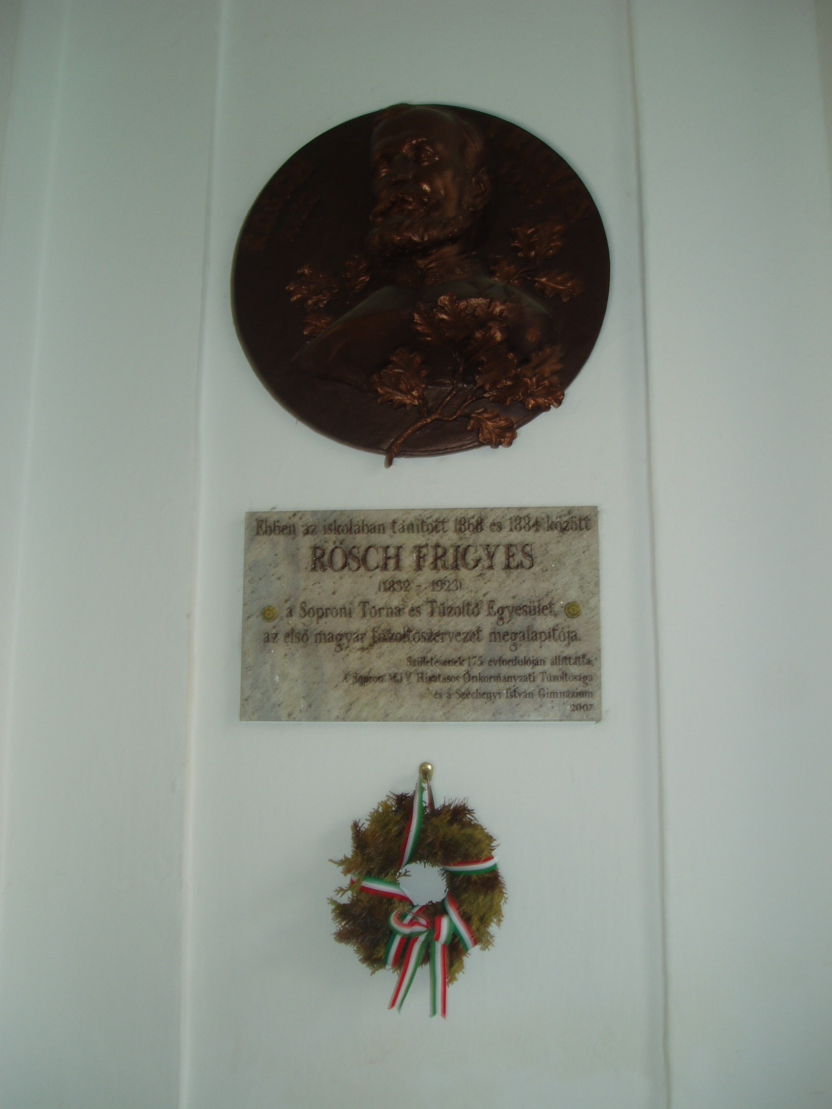 Nyilvános 1111 | 1598 | Sopron, Liszt Ferenc utca 1. | A Széchenyi István Gimnázium eredetileg reáliskola volt, amelyet 1850-ben alapítottak (lásd: Liszt Ferenc utca 2.). A Liszt Ferenc utca sarkán álló épületrészét, amelynek ezen a képen az udvari része látható, 1872-ben építették. A képen látható emléktáblát Rösch Frigyes (1832-1923) emlékére állították, aki 1868 és 1884 között itt tanított. Ő alapította meg a Soproni Torna és Tűzoltó Egyletet. A fénykép 2008 júniusában készült. Felh. irod.: http://szig.sopron.hu/ |