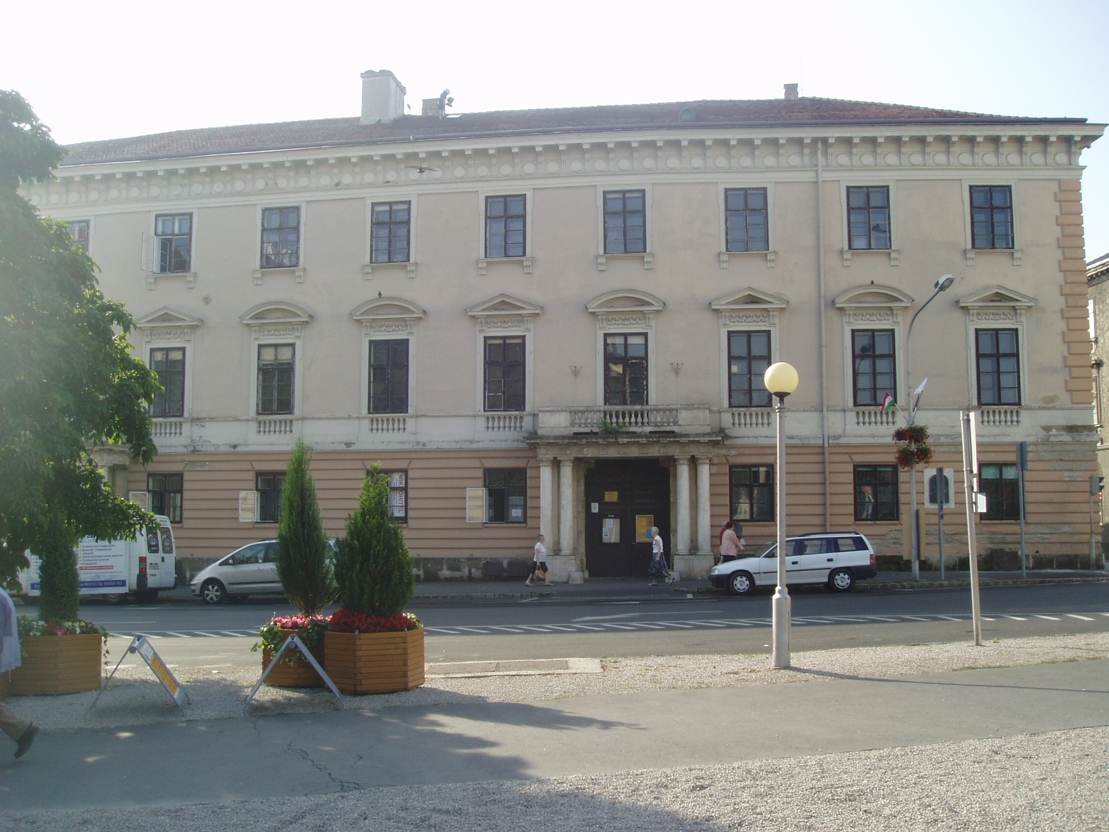 Nyilvános 1035 | 1405 | Sopron, Széchenyi tér 1-2. Széchenyi-palota | A Széchenyi család palotája 1827-ben Hild Vencel tervei alapján épület három barokk ház helyén, amelyek 1765 után kerültek a család birtokába. E régi épületek egyikében őrizte Széchenyi Ferenc annak a gyűjteményének egy részét, amelyet 1802-ben, alapításakor, felajánlott a nemzet múzeumának. A ma itt álló palota végső formáját Széchenyi Pál megbízásából Koch Henrik építőmester alakította ki. A homlokzatán 1933-ban elhelyezett, Haich Erzsébet által készített portrédomborműves emléktábla arról tájékoztat, hogy itt töltötte gyermekéveit a legnagyobb magyar, Széchenyi István. A kép 2008 júniusában készült. Felh. irod.: Czellár Katalin: Sopron. 3. jav. kiad. Bp. Panoráma, 2000 |