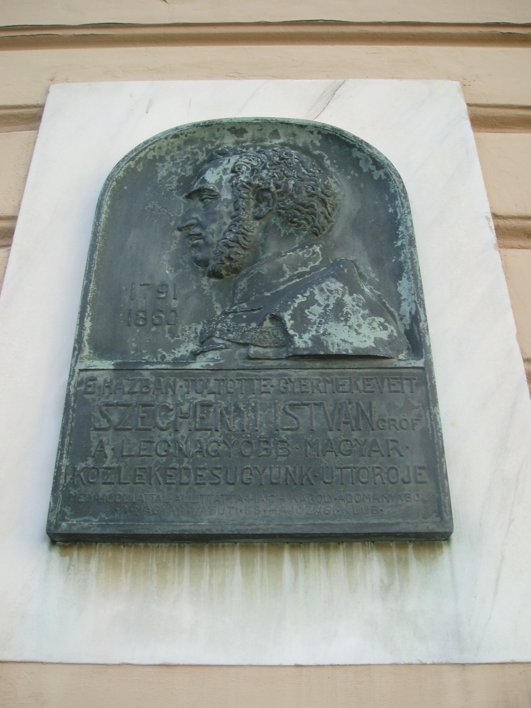Nyilvános 1031 | 1411 | Sopron, Széchenyi tér 1-2. Széchenyi-palota | A Széchenyi család palotája 1827-ben Hild Vencel tervei alapján épület három barokk ház helyén, amelyek 1765 után kerültek a család birtokába. E régi épületek egyikében őrizte Széchenyi Ferenc annak a gyűjteményének egy részét, amelyet 1802-ben, alapításakor, felajánlott a nemzet múzeumának. A ma itt álló palota végső formáját Széchenyi Pál megbízásából Koch Henrik építőmester alakította ki. A homlokzatán 1933-ban elhelyezett, Haich Erzsébet által készített portrédomborműves emléktábla arról tájékoztat, hogy itt töltötte gyermekéveit a legnagyobb magyar, Széchenyi István. A kép 2008 júniusában készült. Felh. irod.: Czellár Katalin: Sopron. 3. jav. kiad. Bp. Panoráma, 2000 |
