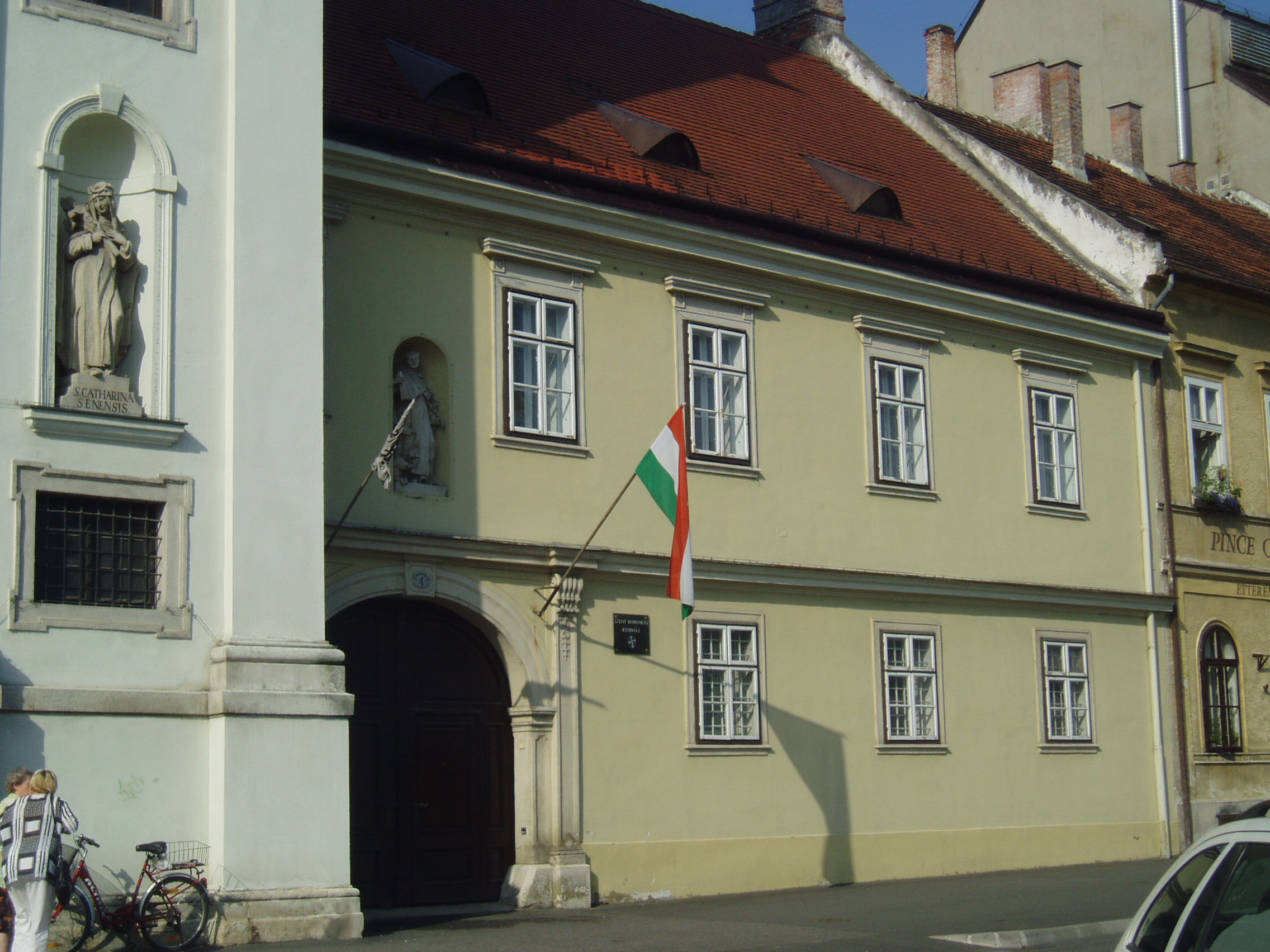 Nyilvános 1031 | 1330 | Sopron, Széchenyi tér 4. | A templom mellett álló egyemeletes kolostort 1745-1750 között építették. A félköríves fülkében Szent Domonkos szobra áll. A Domonkos-rendi szerzetesek 1764-ben telepedtek le Sopronban s 1700-ban vásárolták meg a mai templom és a kolostorépület helyén álló két házat. A kép 2008 júniusában készült. Felh. irod.: Czellár Katalin: Sopron. 3. jav. kiad. Bp. Panoráma, 2000 |