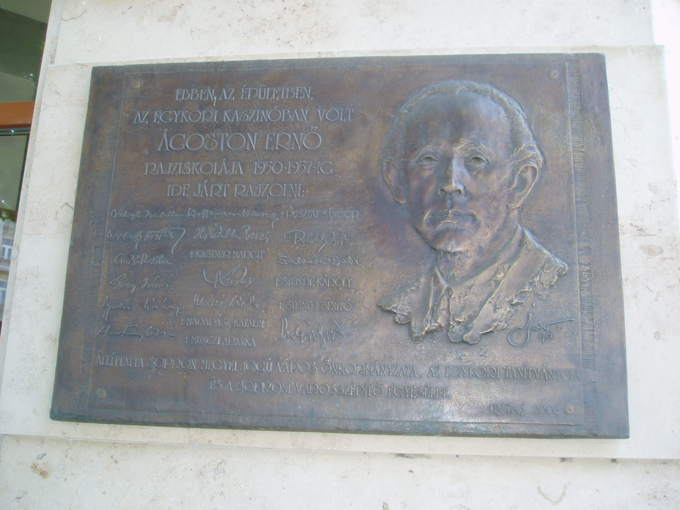 Nyilvános 1085 | 1547 | Sopron, Széchenyi tér 15. A Magyar Művelődés Háza | Mint egy nagyon szép bronz emléktábla tanúsítja, működött 1950 és 1957 között ebben az épületben működött Ágoston Ernő (1889-1957) rajziskolája. A képzőművész Ferenczy Károly és Réti István tanítványa volt, majd szülővárosában, Sopronban vállalt rajztanári állást. Élete főműveinek a kópházai református templomban található freskói számítanak, de mint grafikusművész is jelentőset alkotott. Vezetője volt a Soproni Képzőművészeti Körnek. Festői stílusa a posztimpresszionizmushoz tartozik. Emlléktáblája Kutas László alkotása, 2006-ban avatták fel számos egykori tanítványa jelenlétében. A kép 2008 júniusában készült. Felh. irod.: http://hu.wikipedia.org/wiki/%C3%81goston_Ern%C5%91 http://cyberpress.sopron.hu/article.php?id=12677 |