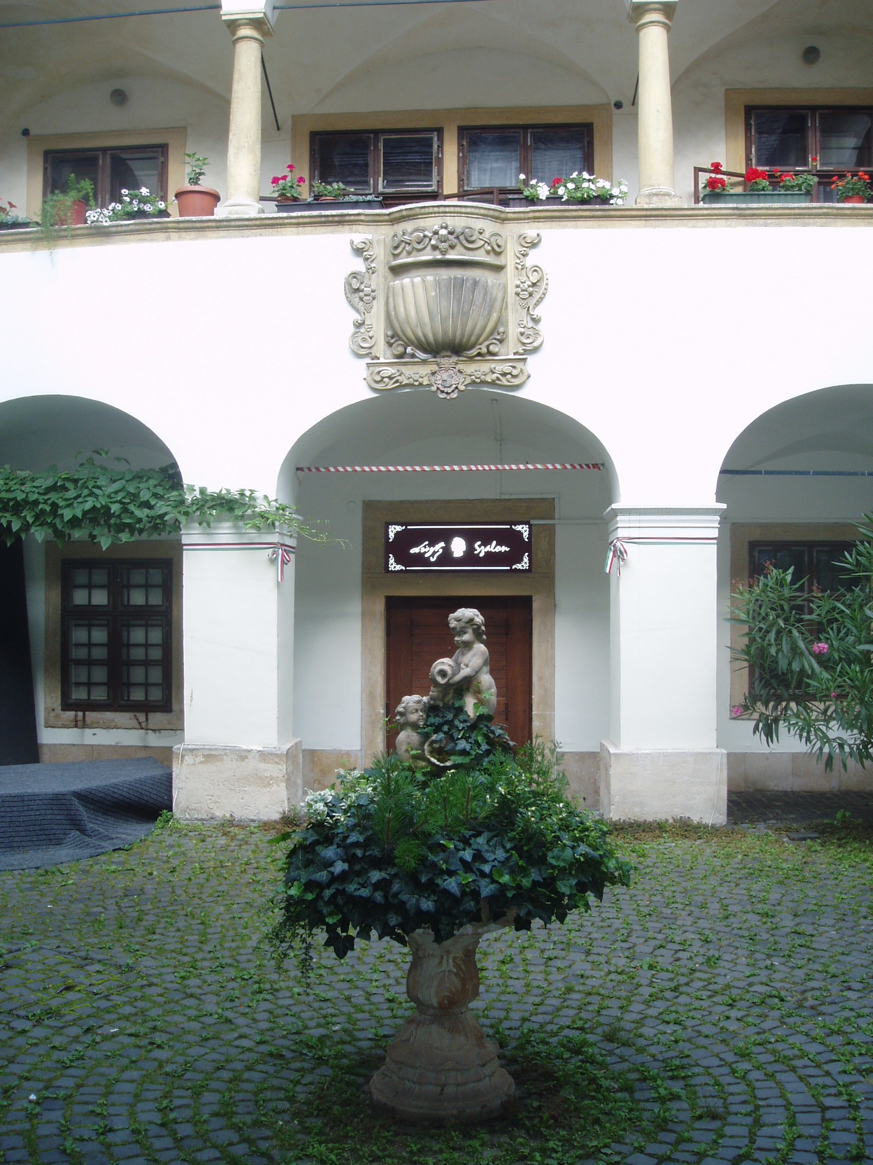 Nyilvános 1075 | 1440 | Sopron, Szent György utca 12. Eggenberg-ház | A XV. századi eredetű, 1674-ben bővített, barokk homlokzatú Eggenberg–ház kapuját a brandenburgi választófejedelem címere díszíti. Udvarán emeleti árkádsor fut körbe. A soproni evangélikusok történetében fontos szerepe volt egykori tulajdonosának, a brandenburgi őrgróf rokonának, Eggenberg hercegnének, aki 1674–76 között engedélyt kapott házában istentiszteletek tartására, ami a Lackner–ház (Fő tér 7.) kivételével tilos volt a városban. Ebből az időszakból maradt meg a kapuval szemközt az épület mellvédjébe épített faragott kő szószék. Alatta ajtó vezet a házban kialakított Liszt szalon helyiségeibe. A kávéházban kiállítás látható a budapesti Liszt Ferenc Emlékmúzeum (lásd: Budapest, VI. Vörösmarty u. 35.) anyagából a Sopronhoz több szállal kötődő Liszt Ferenc életútjáról. Lisztet és körét egy nagyméretű freskó is megidézi a szalon központi helyiségében. A kávéházban rendszeresen koncertekkel és gasztronómiai eseményekkel hódolnak a halhatatlan mester előtt. Az épület előtt járdába ágyazott kis bronztábla jelzi, hogy e hely a soproni Liszt Ferenc sétaút állomása. A közelmúltban jelölték ki azt a virtuális útvonalat, amely Liszt legfontosabb soproni emlékhelyeit köti össze, s melynek további pontjai a következők: Fő tér 8. (Storno–ház), Templom utca 6. (Bezerédj–ház), Petőfi tér 3. (a régi kaszinó), Széchenyi tér 15. (Liszt Ferenc Konferenciaközpont – az egykori új kaszinó, illetve ennek Templom utcai oldalánál álló Liszt–mellszobor). A kép 2008 júniusában készült. Felh. irod.: Czellár Katalin: Sopron. 3. jav. kiad. Bp. Panoráma, 2000 www.lisztfestival.hu |
