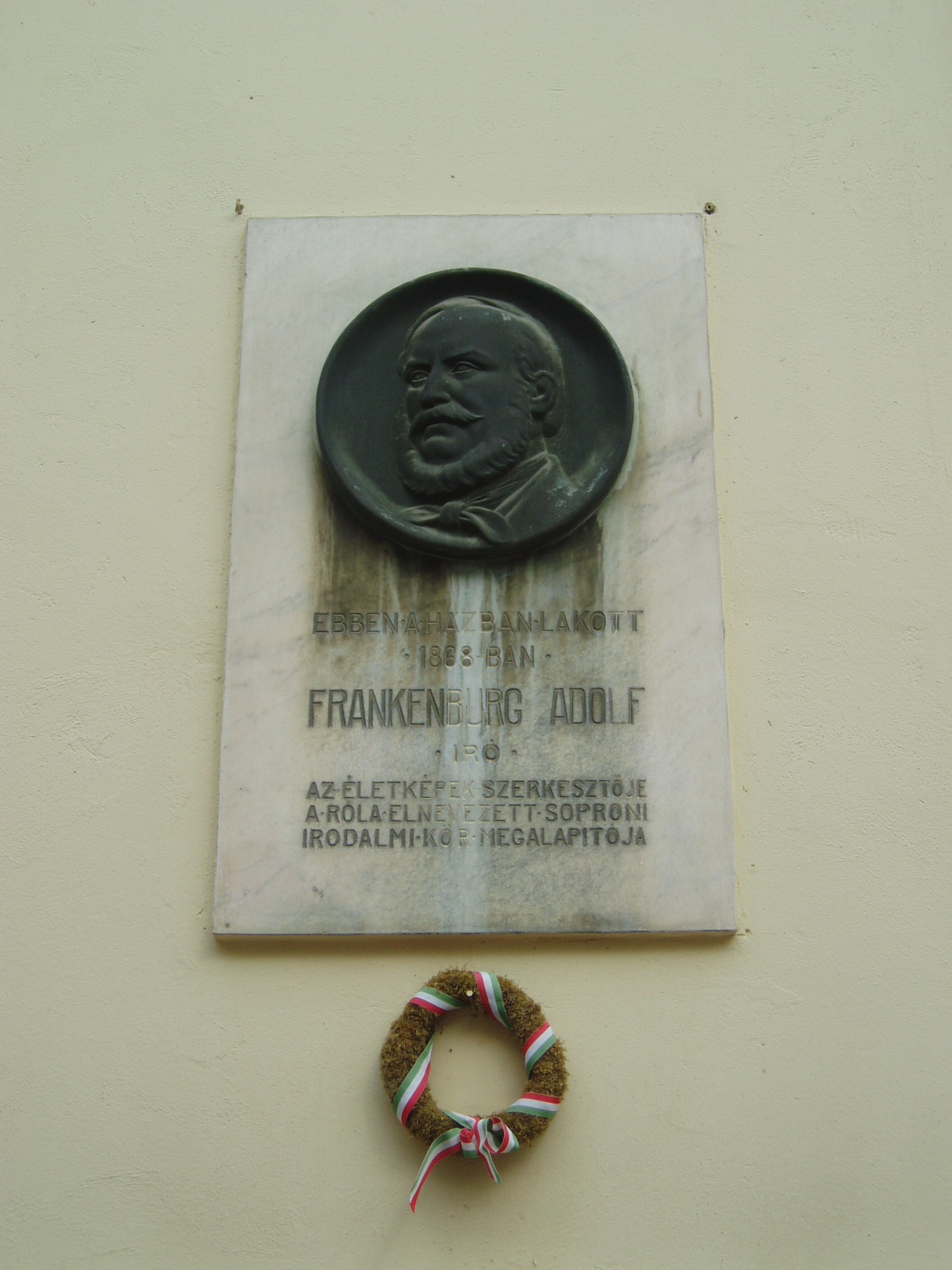 Nyilvános 1011 | 1416 | Sopron, Szent György utca 24. | Az 1860 körül emelt romantikus stílusú épületben lakott Frankenburg Adolf író, szerkesztő és Carina Anna operaénekesnő. Miután belső munkatársa volt Kossuth Pesti Hírlapjának, Frankenburg indította útjára a magyar irodalomtörténetben jelentős szerepet játszó Életképek című folyóiratot. Működése nem volt ínyére a kormányzatnak, ezért 1847-ben kancelláriai titkárnak Bécsbe helyezték. Mintegy két évtizedig élt ott. Sok zaklatásnak volt kitéve, ugyanis gyanúba fogták, hogy szerepet játszott a bécsi felkelés kirobbantásában. 1866-ban nyugdíjazását kérte s hazatért Magyarországra. Második felesége volt Carina Anna, aki 1863 és 1867 között állandó tagja volt a Nemzeti Színház operatársulatának. Ezután Bécsbe szerződött, s a pár a közeli Sopronban telepedett le. Csak hosszú együttélés után, 1881-ben tudtak házasságot kötni, amely rövid életű lett: Frankenburg 1884-ben, Carina Anna 1885-ben elhunyt. Sopronban Frankenburg megalapította az Irodalmi és Művészeti Kört, mely később felvette nevét. Az épületen csak Frankenburg nevét örökíti meg emléktábla, Neszthy Egonné Haich Erzsébet munkája (1934), s évszáma is hiányos. A kép 2008 júniusában készült. Felh. irod.: Berecz Dezső: Frankenburg Adolf harmadik felesége. = Soproni Szemle 1941 Berecz Dezső: Megemlékezés Frankenburg Adolf halálának századik évfordulóján. = Soproni Szemle 1984. 3. |