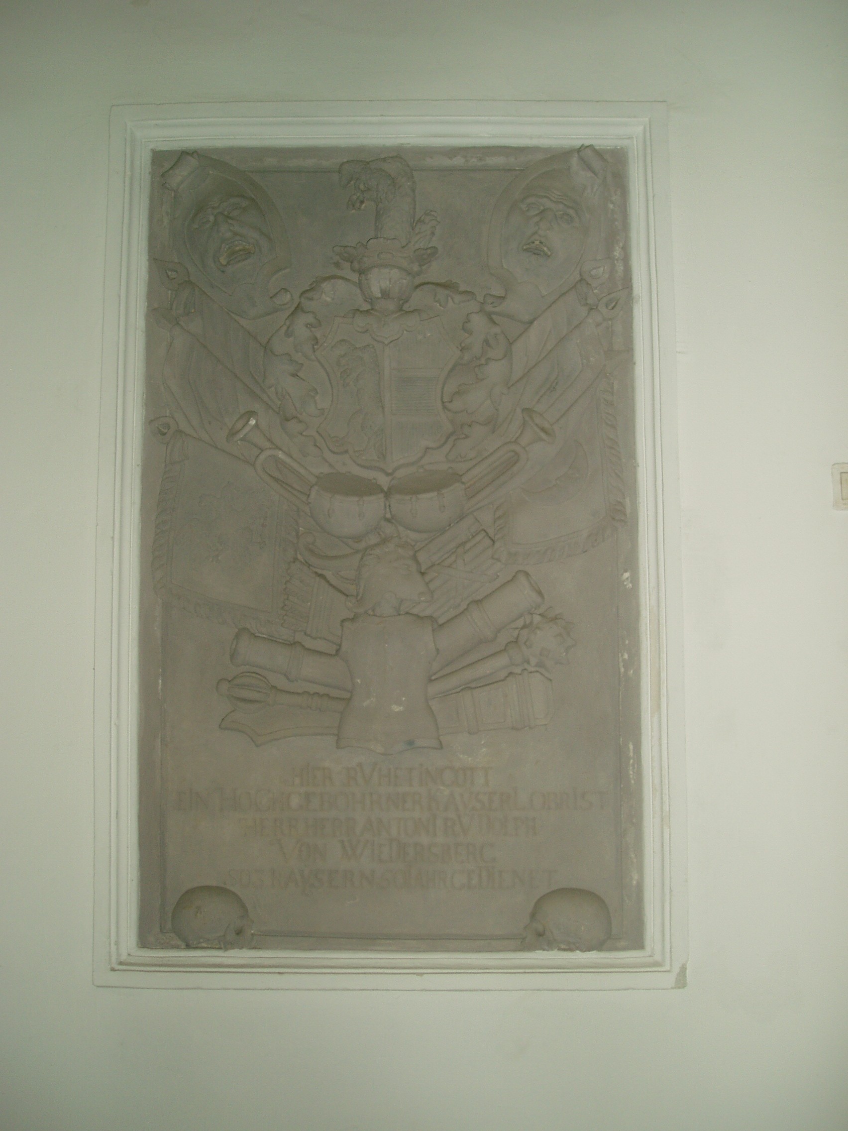Nyilvános 1069 | 1569 | Sopron, Szent György utca 7. Szent György-templom | A Káptalan-házhoz azonos házszámmal csatlakozik a Szent György-templom. Az 1380–1430 között épült, eredetileg gótikus templom mozgalmas, olaszos homlokzata a XVII. századból származik, de rajta két gótikus dombormű máig megőrződött. Kisebb mértékben az 1760-as években is átalakították. Eklektikus tornya 1882-ben épült. Az egyhajós templomot az 1676-os tűzvész után több lépésben alakították át: a csúcsíves lezárású főhajót gazdag stukkóval díszítették, és két oldalán kápolnasorral keretezték. A szentély melletti keresztelőkápolnában középkori freskótöredéket látni. Az 1705–1706 között készült stukkódísz Pietro Antonio Conti műve, és berendezése is XVIII. századi. A képen egy bizonyos Anton Rudolph von Wiedersberg címerrel és hadijelvényekkel díszített sírköve látható (1737), az Utolsó Ítélet-kápolnában. A kép 2008 júniusában készült. Felh. irod.: Czellár Katalin: Sopron. 3. jav. kiad. Bp. Panoráma, 2000 http://www.domsopron.hu |