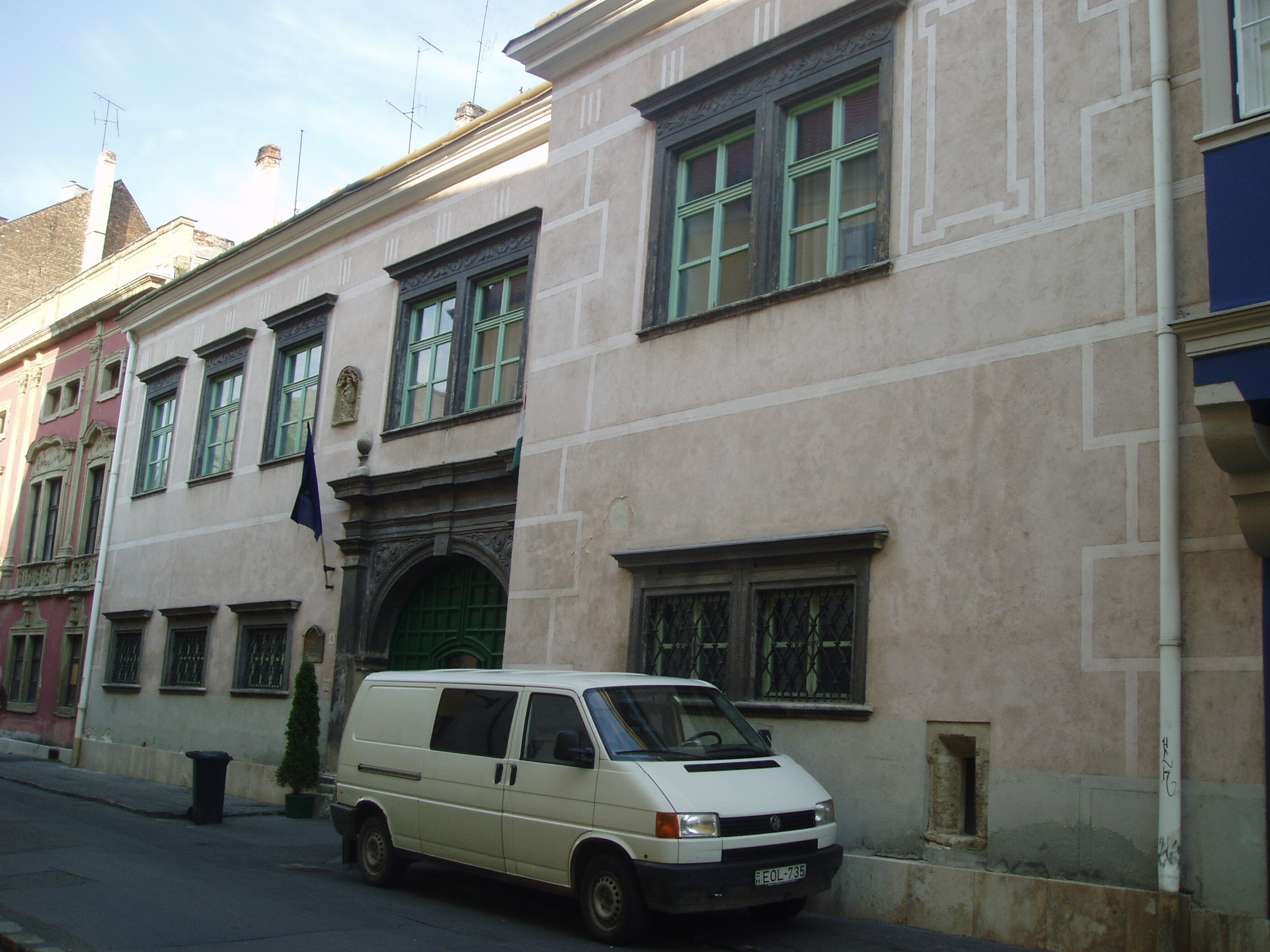 Nyilvános 1327 | 1647 | Sopron, Templom utca 4. Esterházy-palota | A Templom utca 2. számú házhoz hasonlóan ez a középkori eredetű épület is az Esterházy család tulajdona volt 1614-től egészen 1945-ig, előtte pedig Oláh Miklós, a neves humanista érsek családjáé volt. A XVII. századból a kapu és az udvari loggia őrződött meg; homlokzata, amely mintegy folytatása a másik Esterházy–palotának, a XVIII. század közepéről származik. Ebben az épületben állapították meg 1921-ben az antanthatalmak megbízottjai a Sopron és környékének sorsát eldöntő népszavazás eredményét. Az evangélikus templom harangozója hallotta meg elsőként a polgárok közül a jó hírt, s ő kezdte el örömében a harangozást, amihez azután Sopron többi temploma is csatlakozott. A kép 2008 júniusában készült. Felh. irod.: Czellár Katalin: Sopron. 3. jav. kiad. Bp. Panoráma, 2000 |