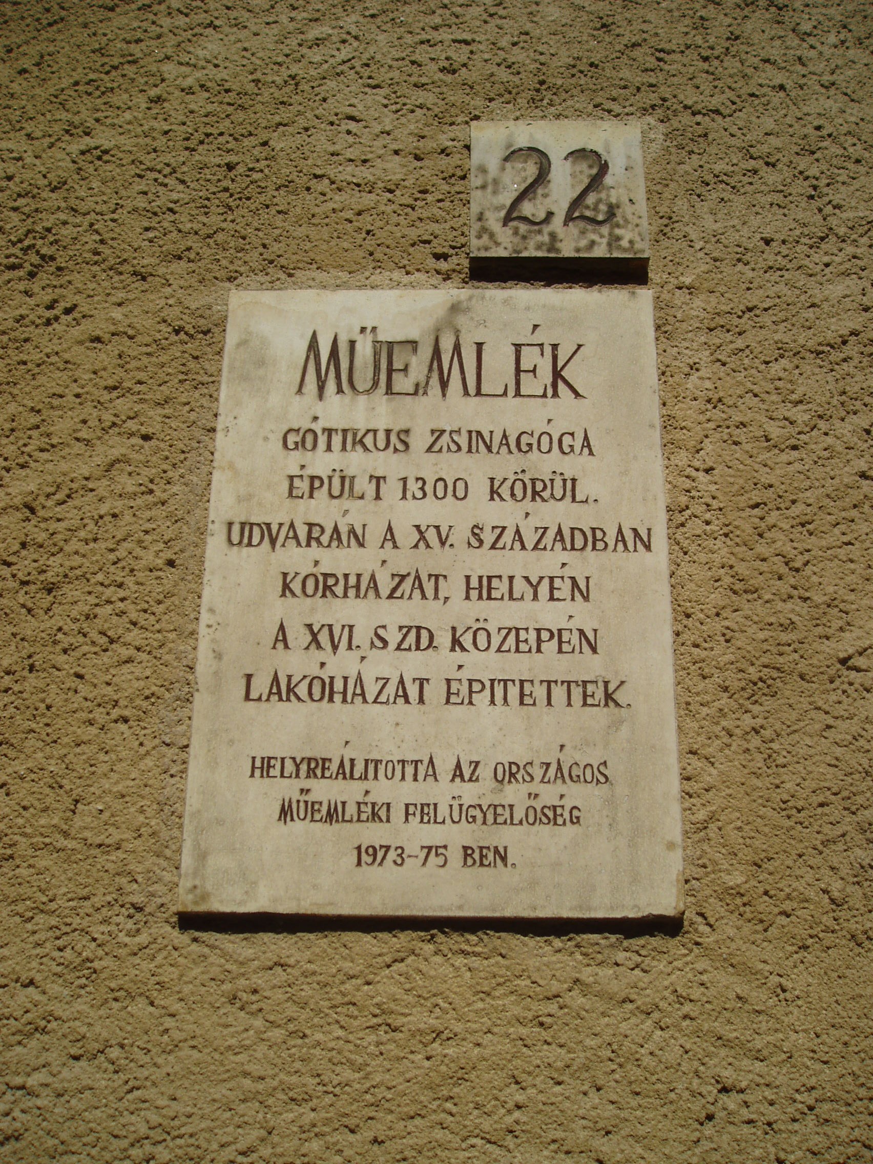 Nyilvános 1041 | 1518 | Sopron, Új utca 22-24. | A 22-24. házszámokkal jelölt épületegyüttes utcai homlokzatát ma két, különálló kapuval összekapcsolt épület alkotja. Mögöttük helyezkedik el a Középkori Ózsinagóga, Sopron zsidó hitközségének első imaháza, amely 1300-1320 körül épülhetett. A kép 2008 júniusában készült. Felh. irod.: Czellár Katalin: Sopron. 3. jav. kiad. Bp. Panoráma, 2000 |