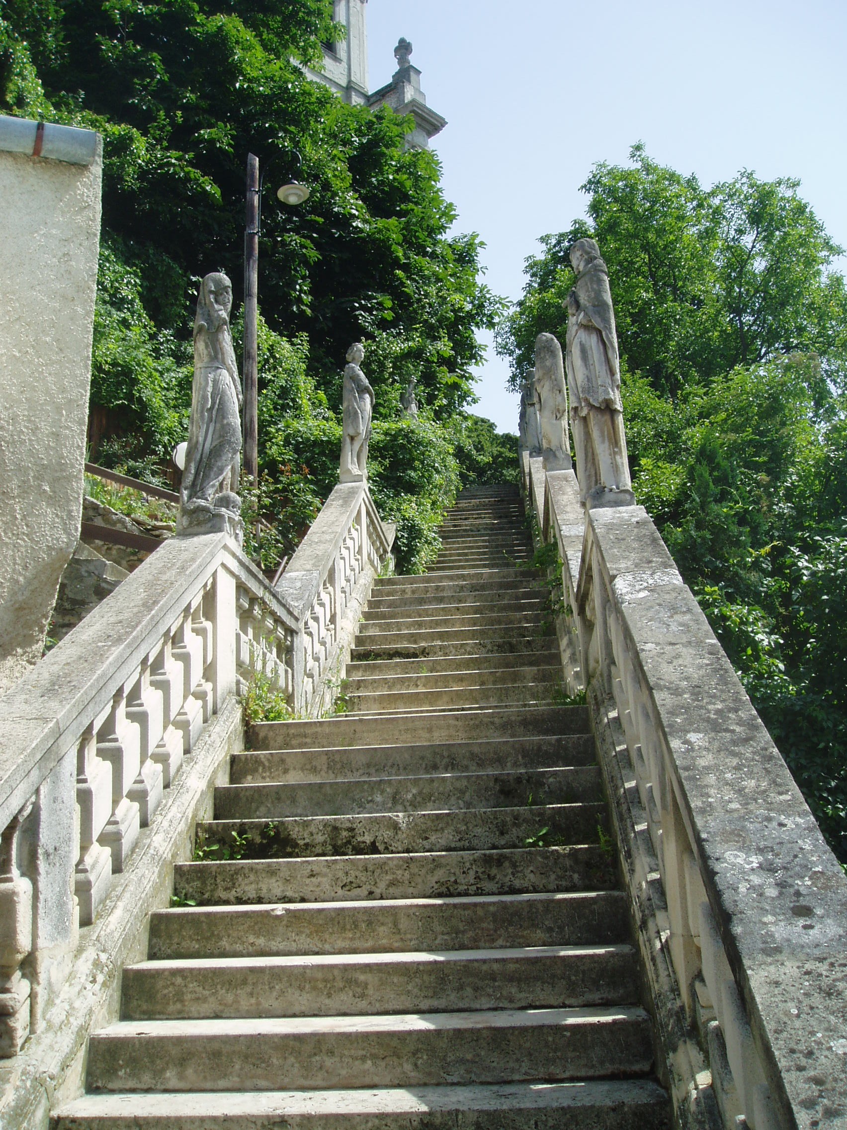 Nyilvános 1420 | 2959 | Sopronbánfalva: Kolostorhegy út: Karmelita templom és kolostor | Sopronbánfalva fölött a Sopronból Brennbergbányára vezető út déli oldán magas domb emelkedik. A dombot uraló gótikus eredetű, első formájában a XV. század végén épült templom és a hozzá csatlakozó barokk kolostorszárnyak eredetileg pálos szerzetesek, majd karmelita apácák otthona volt. Az épületegyüttest a település központjával a meredek domboldalban egyenesen húzódó díszes lépcső köti össze, amelyet karmelita-, vagy pálos lépcsőként ismer a köztudat. A lépcső hét lépcsőkarból és hét pihenőből áll. A pihenőkön, a baluszteres mellvéden jobbról-balról egy-egy szent kőszobra áll. A kép 2008 júniusában készült. Felh. irod.: Czellár Katalin: Sopron. 3. jav. kiad. Bp. Panoráma, 2000 |