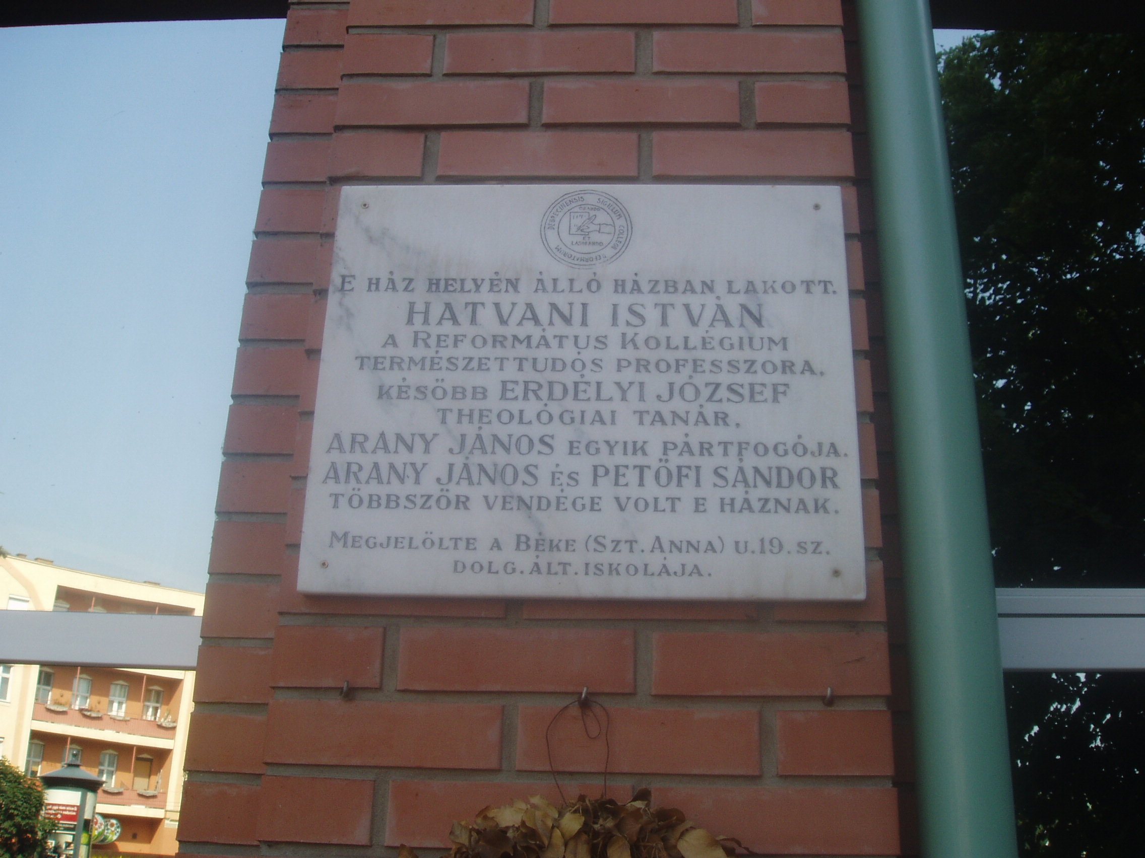 Nyilvános 1147 | 1630 | Debrecen, Kálvin tér 11. | A városháza új épületének helyén, a Péterfia utca Kálvin térbe torkolló részén egykor a Kollégium professzorainak házai álltak, amelyeket sajnos az 1900-as évek közepén bontottak le. A ház első lakója az 1740-es évek első felében Maróthi György, a debreceni Kollégium (lásd: Debrecen, Kálvin tér 16.) fiatal matematikaprofesszora volt, aki a zenéhez is kiválóan értett. Ő alapította meg hazánkban az első többszólamú kórust, a ma is működő Debreceni Kántus elődét. A fiatal professzor itt hunyt el rövid, súlyos betegség után vérhasban 1744. október 16-án. Még nem volt harminc éves. Nem sokkal később ugyanitt lakott Hatvani István (Rimaszombat, 1718. november 21. – Debrecen, 1786. november 16. ) orvos, természettudós, a debreceni Kollégium legendás professzora, "a magyar Faust". Magyarországon ő volt az első, aki tanítás közben fizikai kísérleteket mutatott be. 1757-ben a csillagászat törvényeinek segítségével meghatározta Debrecen városának földrajzi fekvését. Orvosként is nagy híre volt, gyakran meglepő módszereket használt a korabeli orvosláshoz képest. Debrecenben hunyt el 1786-ban; sírköve a debreceni Református Kollégiumban látható. Kéziratait, fizikai eszközeit is a Kollégium őrzi. Varga Imre kitűnő, Hatvani István személye által inspirált szobrát - "A professzor" - a Nagyerdőben, az Egyetemhez közel helyezték el (egy másolata Siófok városközpontjában is látható). "A magyar Faust" szépirodalmi művek ihletője is lett. Arany János 1855-ben verset írt róla. Jókai Mór nagy hatású regényében, az És mégis mozog a földben is szerepelteti a professzor legendás alakját. Ugyancsak lakott a lebontott épületben Erdélyi János (1814-1869) kollégiumi tanár, költő, író, kritikus, filozófus, esztéta, magyar népköltés-gyűjtő. Ő volt a fiatal Arany János egyik pártfogója, akinél debreceni lakásán látogatóban többször is járt Arany és Petőfi Sándor. A fénykép 2006 júniusában készült. Felh. irod.: Papp Antal: Debrecen. Bp. Panoráma, 1976 Kovács Gergelyné: Debrecen. Bp. Panoráma, 1981 Tóth Béla: Maróthi György. Debrecen, 1994 Gyarmati Borbála: Hatvani István (1718-1786) a XVIII. századi magyar mûvelõdéstörténet nagy alakja,a debreceni Kollégium híres polihisztor tanára. = www.atomki.hu/Hatvani/ |
