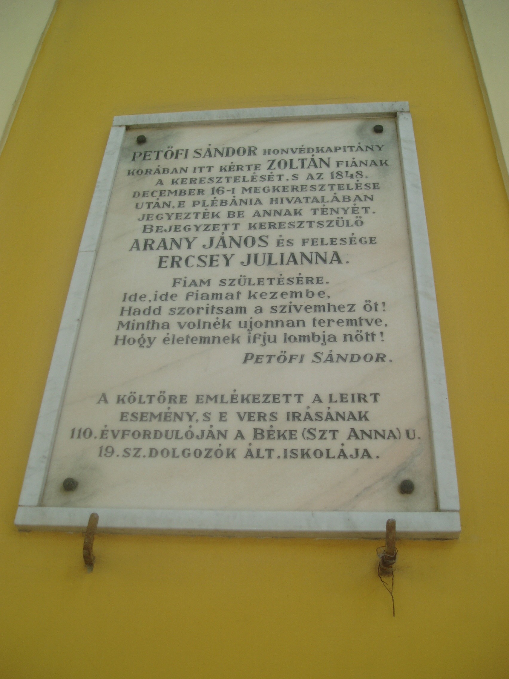 Nyilvános 1128 | 1895 | Debrecen, Szent Anna utca 21. | Mint az épületen lévő emléktáblán is olvasható, ebben a régi plébániaépületben jegyeztette be 1848. december 16-án Petőfi Sándor Zoltán fia megkeresztelését. Petőfi Zoltán itt született Debrecenben, 1848. dec. 15-én a Batthyány utca 16. számú, ma is álló házban. Keresztszüleinek Petőfi - távollétükben - Arany Jánost és feleségét diktálta be. Fia születéséről jóízű feljegyzésekben emlékezett meg a költő: "Maradt volna mint született, becsületes pogány embernek, de Ipam és Napam kedvéért, kik igen buzgó keresztények, meg kellett kereszteltetnem..." Felh. irod.: Papp Antal: Debrecen. Bp. Panoráma, 1976 Petőfi Sándor művei 2. kötet: - - összes prózai művei. Bp. Szépirodalmi Kiadó, 1976 |