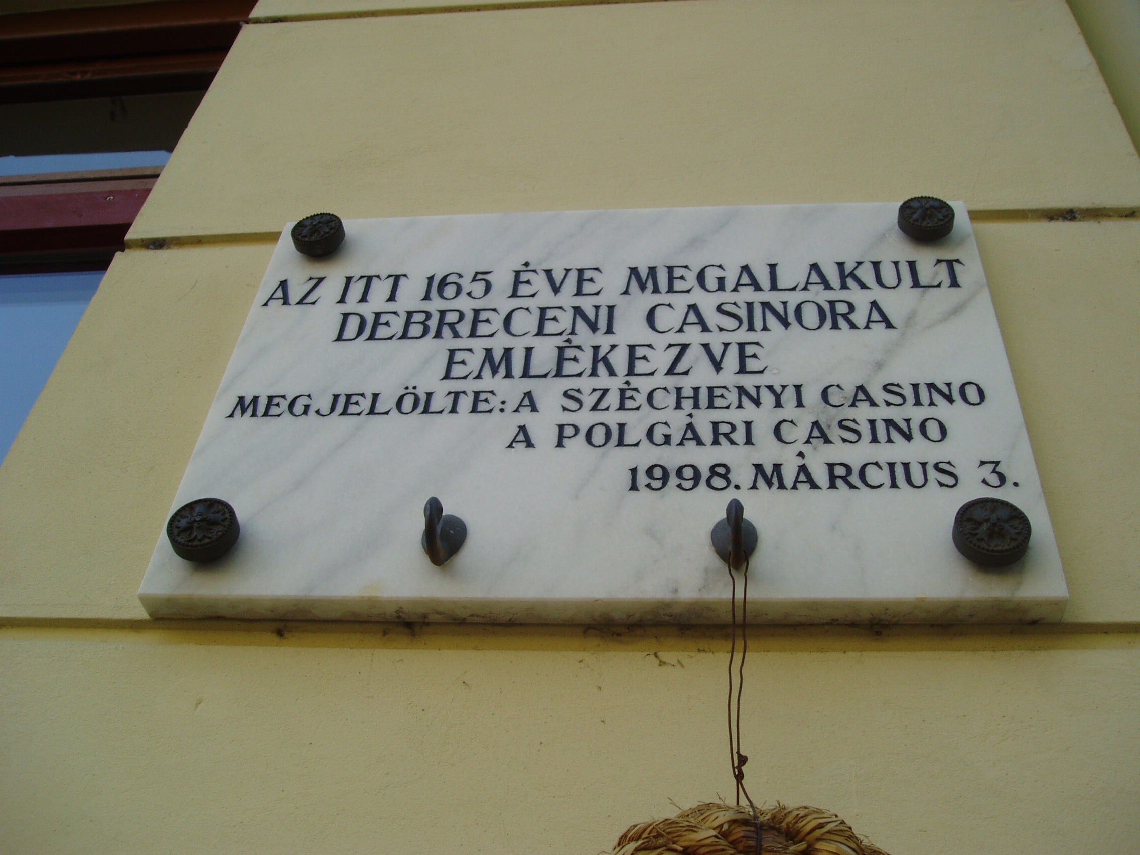 Nyilvános 1148 | 1740 | Debrecen, Piac utca 31. | Ennek a háznak az első emeletén alakult meg Debrecen első kaszinója 1833. márc. 30-án. 1849. ápr. 14-én este a trónfosztás (lásd: Debrecen, Kálvin tér) kimondása után ennek az épületnek azóta lebontott első emeleti erkélyéről beszélt Kossuth Lajos a néphez, amikor Könyves-Tóth Mihály lelkész a város közönsége nevében fáklyás-zenés felvonulás élén üdvözölte. Felh. irod.: Papp Antal: Debrecen. Bp. Panoráma, 1976 Kovács Gergelyné: Debrecen. Bp. Panoráma, 1981 |