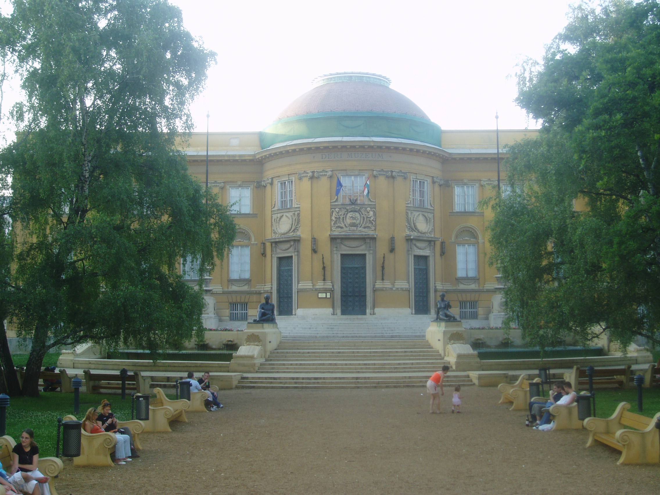Nyilvános 1127 | 1896 | Debrecen, Déri tér 1. Déri Múzeum | Debrecen központjában, a Déri tér 1. szám alatt található a neobarokk stílusú, európai hírű Déri Múzeum, mely Györgyi Dénes és Münnich Aladár tervei alapján épült, és 1930-ban nyitotta meg kapuit a látogatók előtt. A múzeum különleges tárgyi anyagának alapját az 1902-ben Löfkovics Artúr ékszerész-műgyűjtő (lásd: Debrecen, Piac u. 38.) kezdeményezésére és adományából megalakult Városi Múzeum anyaga képezte. Nagy jelentőségű volt, hogy 1920-ban Déri Frigyes (1852-1924) bécsi selyemgyáros csodálatos gyűjteményét Debrecen városának ajándékozta. Bátyja példáját követve, 1938-ban Déri György a Kárpát-medence minden népének népművészeti alkotásaiból álló, páratlan gyűjteményét adományozta a múzeumnak. A későbbiek során neves néprajzkutatók, történészek, régészek gyarapították tovább kitartó gyűjtőmunkájukkal ezt a gazdag tárgyegyüttest. A múzeum és azon belül a képzőművészeti gyűjtemény legnagyobb vonzereje Munkácsy Mihály "Krisztus-trilógiájá"-nak együtt látható festményei: a Krisztus Pilátus előtt, a Golgota és az Ecce homo. Mint Szabó Magda Für Elise című regényében olvasható, az Ecce homo festmény kapcsán történt meg vele az az eset, ami sokáig rányomta bélyegét iskolai megítélésére. A közös múzeumlátogatás után magyar dolgozatot kellett írni a festmény egy alakjáról, s Szabó Magda a kép előterében levő kóbor kutyát választotta. S bár írását az osztály szeme láttára kellett miszlikbe szaggatnia, ugyanakkor általa megszerezte egy kitűnő tanár támogatását, akinek íróvá válásában sokat köszönhetett. A fénykép 2006 júniusában készült. Felh. irod.: www.museum.hu Szabó Magda: Für Elise. Bp. Európa Kiadó, 2002 |