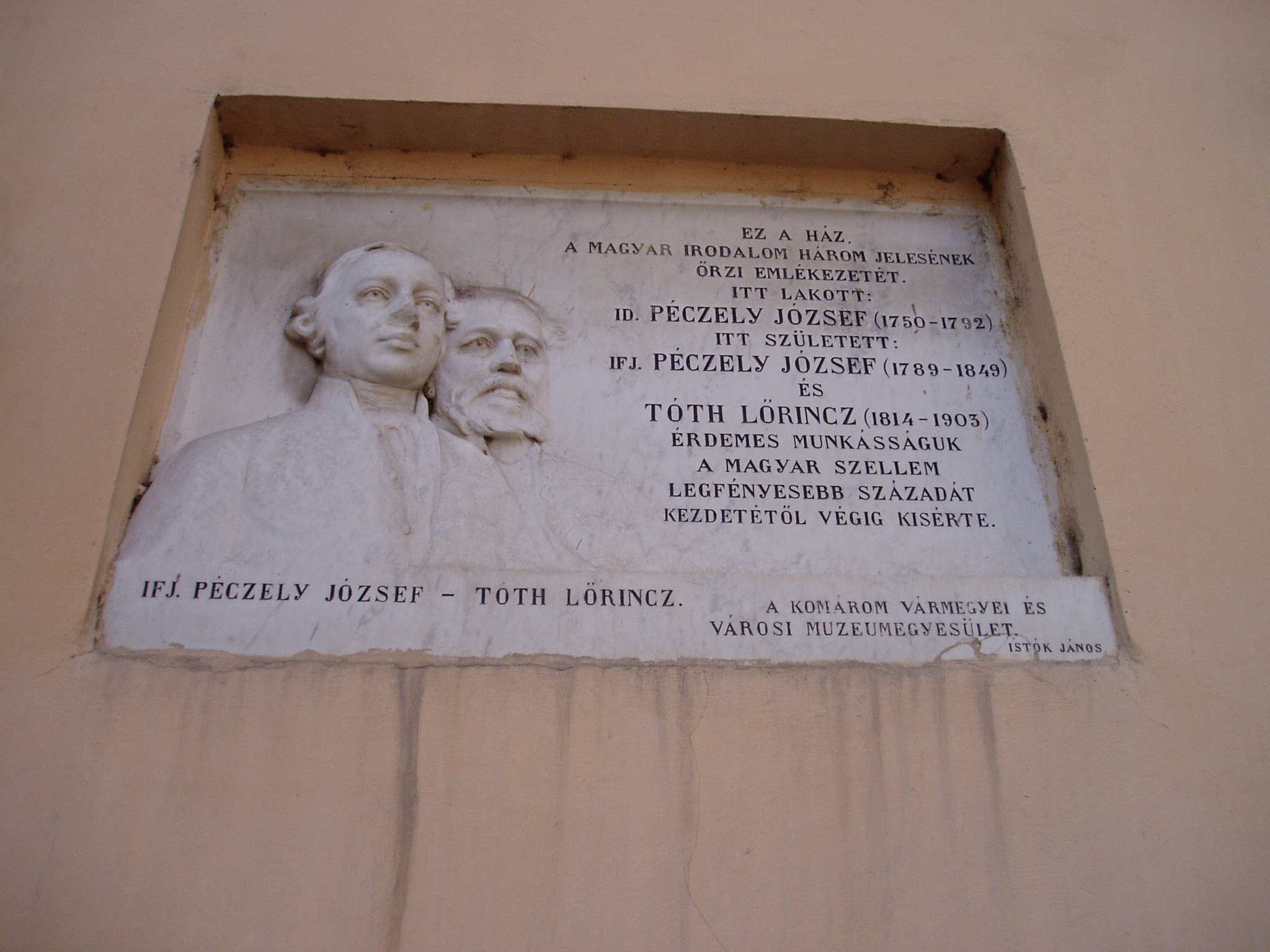 Nyilvános 1603 | 3852 | Komárom (Komárno), Ferences barátok u. 22. | Ez a ház volt a régi református lelkészlak. Itt lakott 1783-tól haláláig id. Péczeli József (1750-1792) költő, műfordító, aki 1789-ben megszervezte a Komáromi Tudós Társaságot, megalapította és szerkesztette az 1789 és 1792 között megjelenő első magyar tudományos-ismeretterjesztő folyóiratot, a Mindenes Gyűjteményt. Szintén ebben a házban lakott Mindszenthy Sámuel (1751-1806) író, lexikonkiadó, a Mindenes Gyűjtemény társszerkesztője. Ebben a házban született Péczely József fiaként ifj. Péczely József (1789-1849) tanár, történész, akadémikus, valamint Tóth János református lelkész fiaként Tóth Lőrinc (1814-1903) író, jogtudós, a Magyar Tudományos Akadémia tagja, ügyésze és pénztárosa. 1845-től a XX. század elejéig itt laktak a dunántúli református egyházkerületnek a tudományokban, az irodalomban és a közéletben is tevékeny püspökei: 1845-76 között Nagy Mihály (1788-1878) hittudós, több egyházi mű szerzője; 1878-1895-ben Pap Gábor (1827-1895) költő, országgyűlési képviselő, szenvedélyes könyv- és éremgyűjtő; 1895-től az 1900-as évek elejéig Antal Gábor, számos társadalmi, közgazdasági és bölcseleti értekezés szerzője. A ház homlokzatán a Komárom vármegyei és városi Muzeum-egyesület 1904-ben id. Péczeli Józsefre, ifj. Péczeli Józsefre és Tóth Lőrincre emlékeztető márványtáblát helyezett el, amelyet Istók János szobrászművész alkotott. A táblát 1945-ben eltávolították, s csak hosszú idő után, 1991-ben került vissza eredeti helyére. A fénykép 2005. júliusában készült. Felhasznált irodalom: Mácza Mihály: Komárom mevezetességei. Pozsony, Madách-Posonium, 2002 |