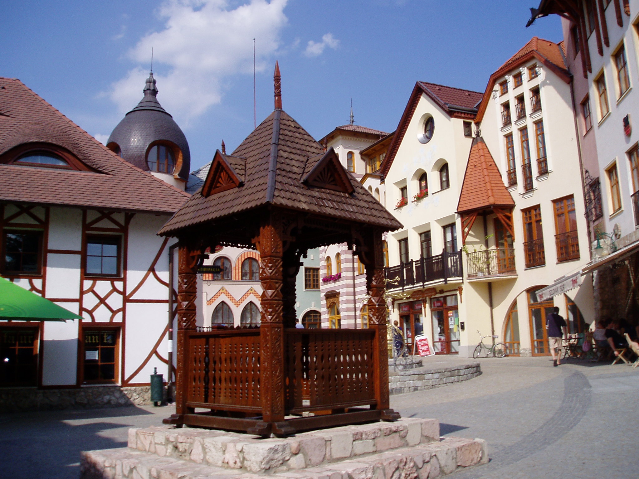 Nyilvános 1942 | 6706 | Komárom (Komárno), Európa udvar | A közelmúltban a Zichy–palota (lásd: Klapka tér 9.) udvarán építették ki az ún. Európa udvart. A helyi viszonylatban gigantikus méretű vállalkozás célja, hogy élőben mutassa be harmincöt európai ország építészetét. A városrész egyben Komárom új szolgáltató központja is, üzletekkel, éttermekkel, kávézókkal, valamint egy föld alatti bevásárlóközponttal. A fénykép 2005. júliusában készült. Felh.irod.: www.komarno.sk Mácza Mihály: Komárom nevezetességei. Pozsony, Madách-Posonium, 2002 |