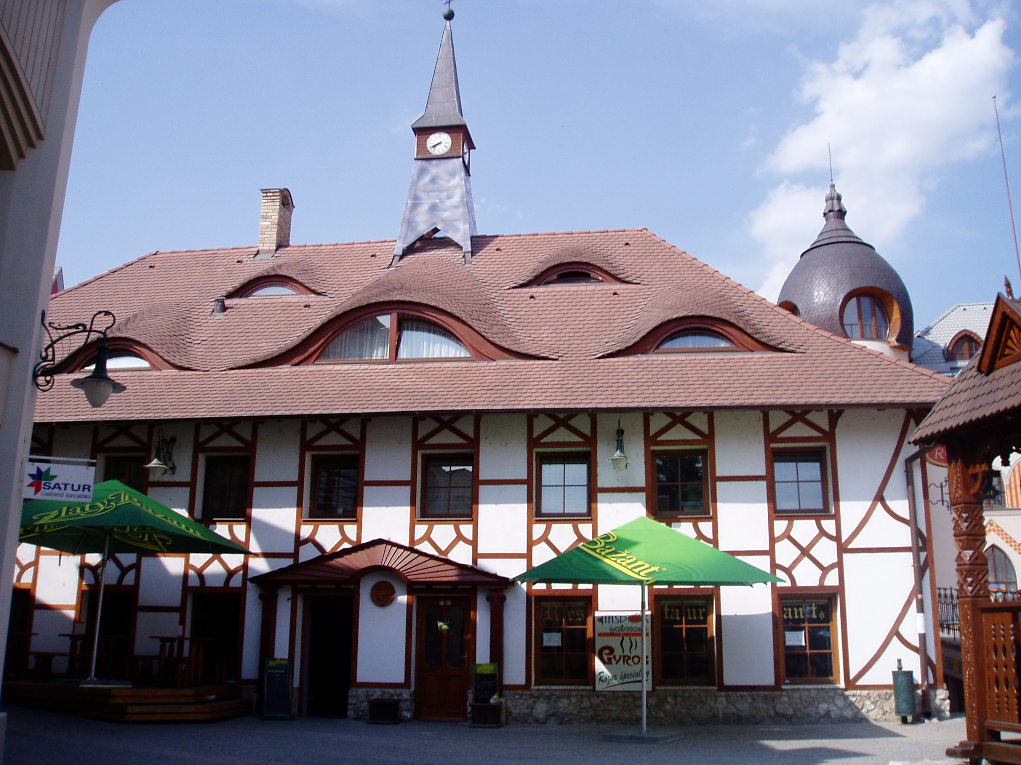 Nyilvános 1549 | 4875 | Komárom (Komárno), Európa udvar | A közelmúltban a Zichy–palota (lásd: Klapka tér 9.) udvarán építették ki az ún. Európa udvart. A helyi viszonylatban gigantikus méretű vállalkozás célja, hogy élőben mutassa be harmincöt európai ország építészetét. A városrész egyben Komárom új szolgáltató központja is, üzletekkel, éttermekkel, kávézókkal, valamint egy föld alatti bevásárlóközponttal. A fénykép 2005. júliusában készült. Felh.irod.: www.komarno.sk Mácza Mihály: Komárom nevezetességei. Pozsony, Madách-Posonium, 2002 |