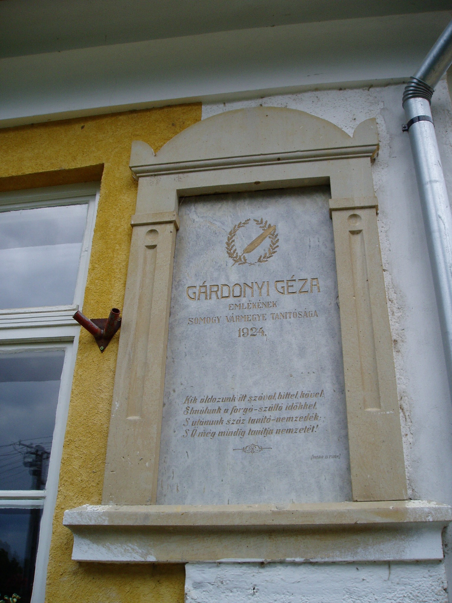 Nyilvános 1175 | 2024 | Karád, Gárdonyi Géza utca 2. | A klasszicista formáját ma is őrző földszintes iskolaépület falán két emléktábla is olvasható. A korábbi, 1924-ben avatott tábla Gárdonyi Géza írónak állít emléket, aki — még mint Ziegler Géza — itt kezdte tanítói pályafutását 1882-ben. Később írásaiban kissé keserűen, csalódottan örökítette meg ezt az időszakot. Az én falum című novelláskötete a karádi, nem éppen felhőtlenül boldog éveket, anyagi nyomorúságát idézi, ugyanakkor felejthetetlen képet rajzolt benne a környezetről és a falusi emberekről. A másik emléktábla Kodály Zoltánt idézi, aki 1933 és 1938 között több alkalommal is járt a községben. Ide, az iskola épületébe hívta össze Happ József tanító az énekelni szerető falusiakat, s Kodály népdalokat gyűjtött tőlük. Happ József hamarosan Budapesti lakásán kereste fel Kodályt, s felkérte, hogy a gyűjtött dalokból állítson össze egy csokrot a falu fennállásának 1934-ben ünnepelt 800. évfordulójára. Így született meg Kodály nevezetes férfikari műve, a Karádi nóták – Karád 800 éves évfordulójának ünnepére, amellyel halhatatlanná tette a kis falu nevét. A fénykép 2005 júliusában készült. Felh. irod.: Látnivalók Somogy megyében. Miskolc, Well-PRess, 2000 /Vendégváró/ Herke Mihály: „Kocsmárosné gyöngyviolám” – Kodály és Karád. = Somogy 1982. 6. |