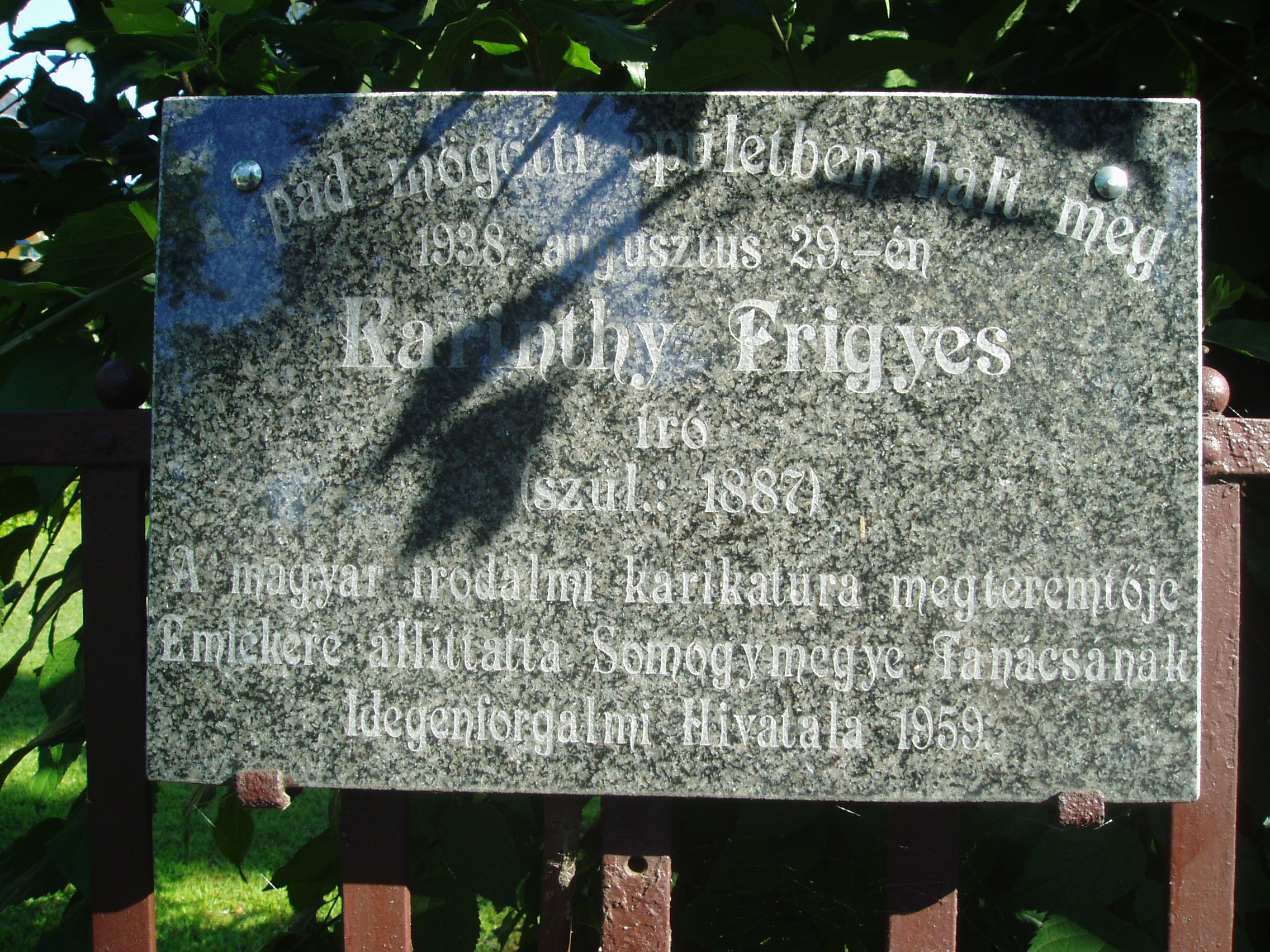 Nyilvános 1213 | 2183 | Siófok, Batthyány utca 46. | Siófok egyik legendás épülete és intézménye a volt Vitéz Panzió. Az épületet az akkori idők egyik legtehetségesebb művésze, a kiskorpádi születésu Kozma Lajos (1884-1948) Kossuth-díjas építész tervezte. Az évtizedek során számos nevezetes vendége volt. Az épület előtt támaszkodik a kerítésnek Karinthy Frigyes emlékpadja. Ebben a házban hunyt el 1938. augusztus 29-én a XX. század legegyetemesebb érdeklődésű és egyik legtermékenyebb magyar írója. Karinthy Frigyes - családjával együtt - évtizedeken keresztül volt a Vitéz Panzió viszatérő vendége. Az író imádta Siófok nyári hangulatát, vendéglőit, a kaszinók éjszakai mondén életét s a délutáni kártyacsatákat. A Stockholmban 1936-ban elvégzett agyműtét után még felépült, de két év múlva itteni szobájában agyvérzést kapott és meghalt. Utolsó estéjén még meglátogatta a panzióban jóbarátja, Rejtő Jenő. Karinthy Frigyes fiai, a tragikus sorsú költő, Karinthy Gábor és Cini, azaz Karinthy Ferenc író is nagyon sokat tartózkodtak itt. Karinthy Ferenc az itteni életet, ifjúságának csínyjeit számos írásában rögzítette. Faludy György költő is lakott a Vitéz-panzióban. “Itt nyaraltunk 1914-től 1918-ig minden nyáron. Apám akkor katona volt. A Batthyány utca 7.-ben laktunk a szüleimmel, illetve apámmal, aki a frontról egyszer meg is látogatott bennünket. Aztán később is megfordultam Vitéz Miklósné panziójában, amikor Karinthy Frigyes is itt nyaralt" - mesélte később a költő. Felmerült az ötlet, hogy az épületben létrehozzák Karinthy Frigyes emlékmúzeumát, de a megvalósítás még messze van. Viszont 1998-ban a Rózsakertben (a Balaton-parton) felállították egészalakos szobrát, Varga Tamás alkotását. A fénykép 2006 júliusában készült. Felh. irod.: http://www.siofok.hu/seta_a_varosban_hu.php Matyikó Sebestyén József: Zsidók Siófokon. Debrecen, Ethnica, 2000 |