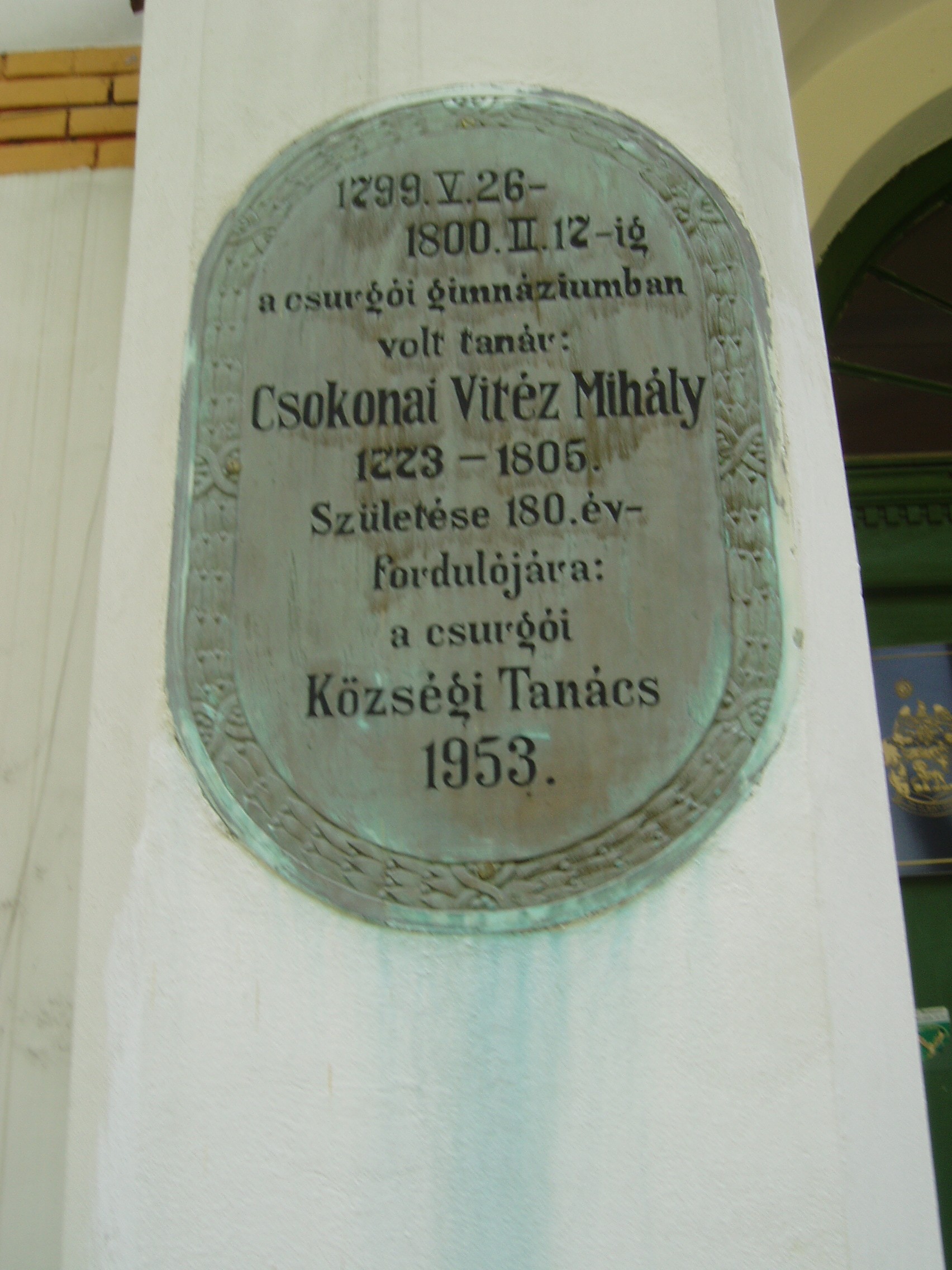 Nyilvános 1503 | 3853 | Csurgó, Széchenyi tér 9. Csokonai Vitéz Mihály Református Gimnázium és Általános Iskola | A XVIII. század végén alapított somogyi "első oskola" száz évvel később, 1897-ben költözhetett be új, mostani, akkor még csak egyemeletes otthonába. Az intézmény első, történelmi épületében (lásd: Csokonai u. 24.) ma a Városi Múzeum gyűjteménye tekinthető meg. A gimnázium mai épülete a régi iskola közelében, hatalmas parkban - az egykori vadasparkban - áll. Kapuja mellett 1953-ban állított emléktábla tudatja, hogy egykor az intézmény elődében tanított Csokonai Vitéz Mihály. A nagy szárnyas ajtón az iskola aulájába lépve két szép, vörös márványba foglalt bronz dombormű fogadja a látogatót: Festetics György, az iskolaalapító gróf és az intézmény halhatatlan segédtanára, Csokonai Vitéz Mihály. Az 1931-ben felavatott domborművek alkotója Horvay József szobrászművész. Az Alapító és a Költő domborművén kívül az egykori neves tanárok arcképcsarnoka is a hagyományok tiszteletére figyelmezteti a diákokat, látogatókat. Méltán híres az iskola muzeális könyvtára is. A fénykép 2004 októberében készült. Felh. irod.: Horváth József: Csurgó. Műemlékek. Bp. Tájak, Korok, Múzeumok Kiskönyvtára 441. 1982 Csurgói kalauz. Szerk. Terényi Zoltán. 1974 Látnivalók Somogy megyében. Miskolc, Well-PRess Kiadó, 2000 www.vendegvaro.hu |