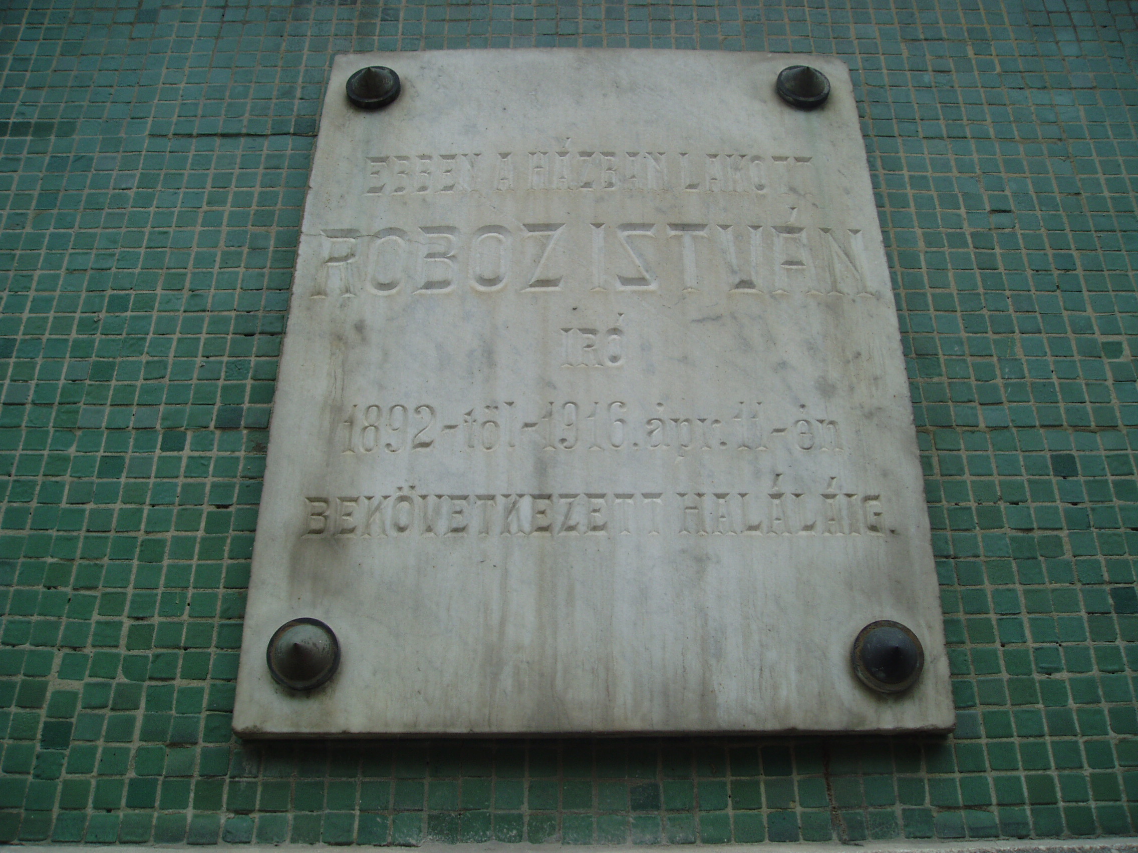Nyilvános 1162 | 2164 | Kaposvár, Dózsa utca 16. | A korábban ezen a helyen állott házban lakott 1892-től 1916-ban bekövetkezett haláláig Roboz István író, szerkesztő. Halála után az eredeti épületet emléktáblával jelölték meg, amelyet 1996-ban áthelyeztek az itt felépített új épületre, egy kiegészítő szöveges táblával együtt. Roboz István (Kötcse, 1828. okt. 26. - Kaposvár, 1916. ápr. 11.): költő, író, újságíró. Pápán Petőfi és Jókai iskolatársa volt. Diákéveit "Petőfi Sándor és az én pápai emlékeim" című, forrásértékű visszaemlékezéseiben örökítette meg. A szabadságharc alatt kormánybiztosi titkár Kaposvárott. Végleg 1856-ban telepedett le a városban, ahol először törvényszéki bíróként, később főjegyzőként dolgozott. Nagy aktivitással kapcsolódott be a dél-dunántúli irodalmi életbe. 1866-ban megalapította a Somogy című lapot, amelyet haláláig szerkesztett. Elnöke volt a Somogy vármegyei Berzsenyi Társaságnak. Ő írta - a hagyomány szerint az ádándi kastélyban - 1849-ben a később több nyelvre is lefordított "Kossuth imája a kápolnai csatában elesettek felett" című verset, amelyet a helyszínen felolvasott Wesselényi Miklósnak és Kemény Zsigmondnak. Az ima az 1850-es években a legismertebb hazafias fohász volt. A fénykép 2006 márciusában készült. Felh. irod.: Életrajzi lexikon www.adand.hu |