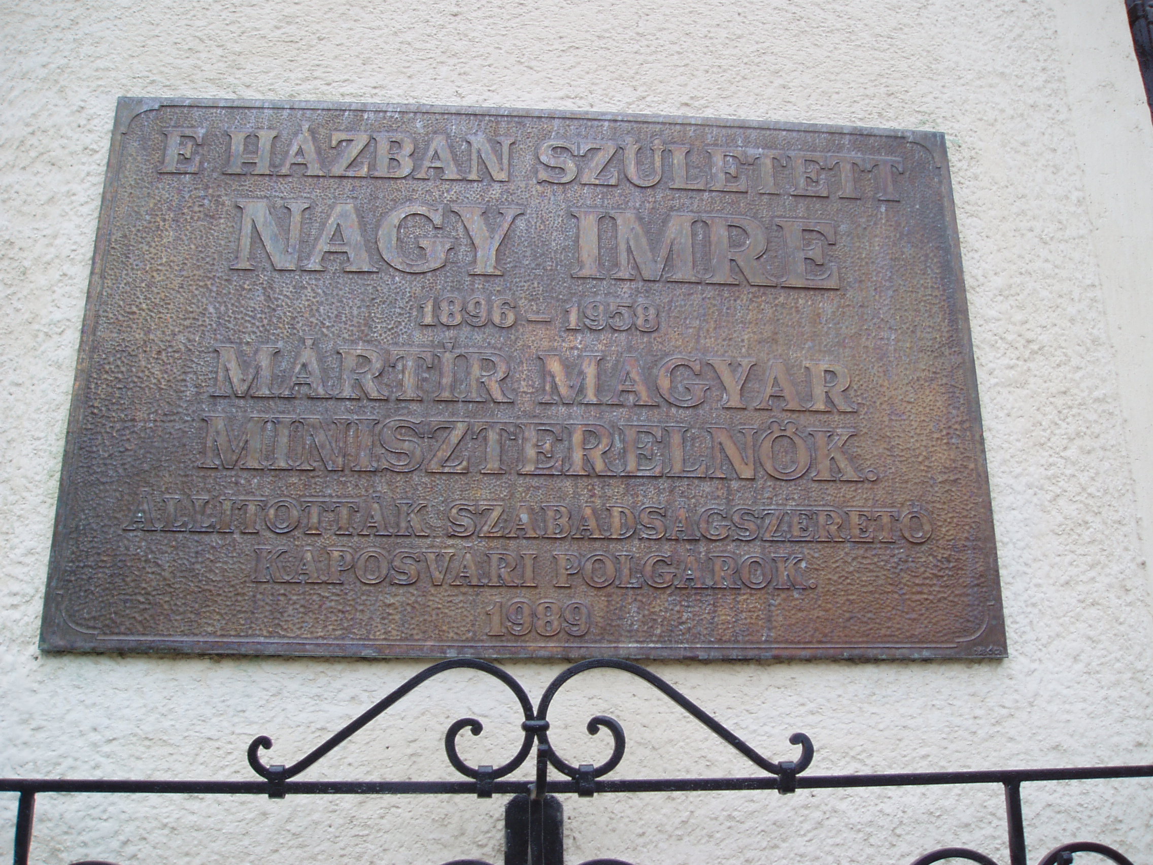 Nyilvános 1184 | 1955 | Kaposvár, Fő utca 77. | Kaposvár hosszú főutcájának a városközponttól távolabbi részén ma is álló kis házban született Nagy Imre mártír miniszterelnök 1896. június 7-én. Emléktábláját 1989-ben, rehabilitálásának évében helyezték el. 1996-ban, a forradalom 40. évfordulójára szobrot is állítottak emlékére a Megyeháza előtt, az 56-os emlékmű mellett (Paulkovics István alkotása). Nagy Imre református szegényparaszti családból származott. Apja postai szerelőmunkás volt. Anyja, mielőtt férjhez ment volna, a somogyi alispánnál cselédlányként szolgált. Tanulmányait a 4 elemi (lásd: Kaposár, Fő u. 44.) és a 4 polgári osztályig végezte, mert 1912-ben saját elhatározásból elhagyta kaposvári gimnáziumot és géplakatos segédnek állt. A segédi oklevelet 1914-ben szerzete meg, majd a tanulmányait folytatandó beiratkozott a kaposvári felső kereskedelmi iskolába. Ezt már nem tudta elvégezni, mert 1915 májusában behívták katonának. A Monarchia katonájaként 1918-ban az orosz fronton fogságba esett. Politikai pályafutása ekkoriban kezdődött el. A fénykép 2006 márciusában készült. Felh. irod.: Látnivalók Somogy megyében. Miskolc, Well-PRess, 2000 hu.wikipedia.org/wiki/Nagy Imre |