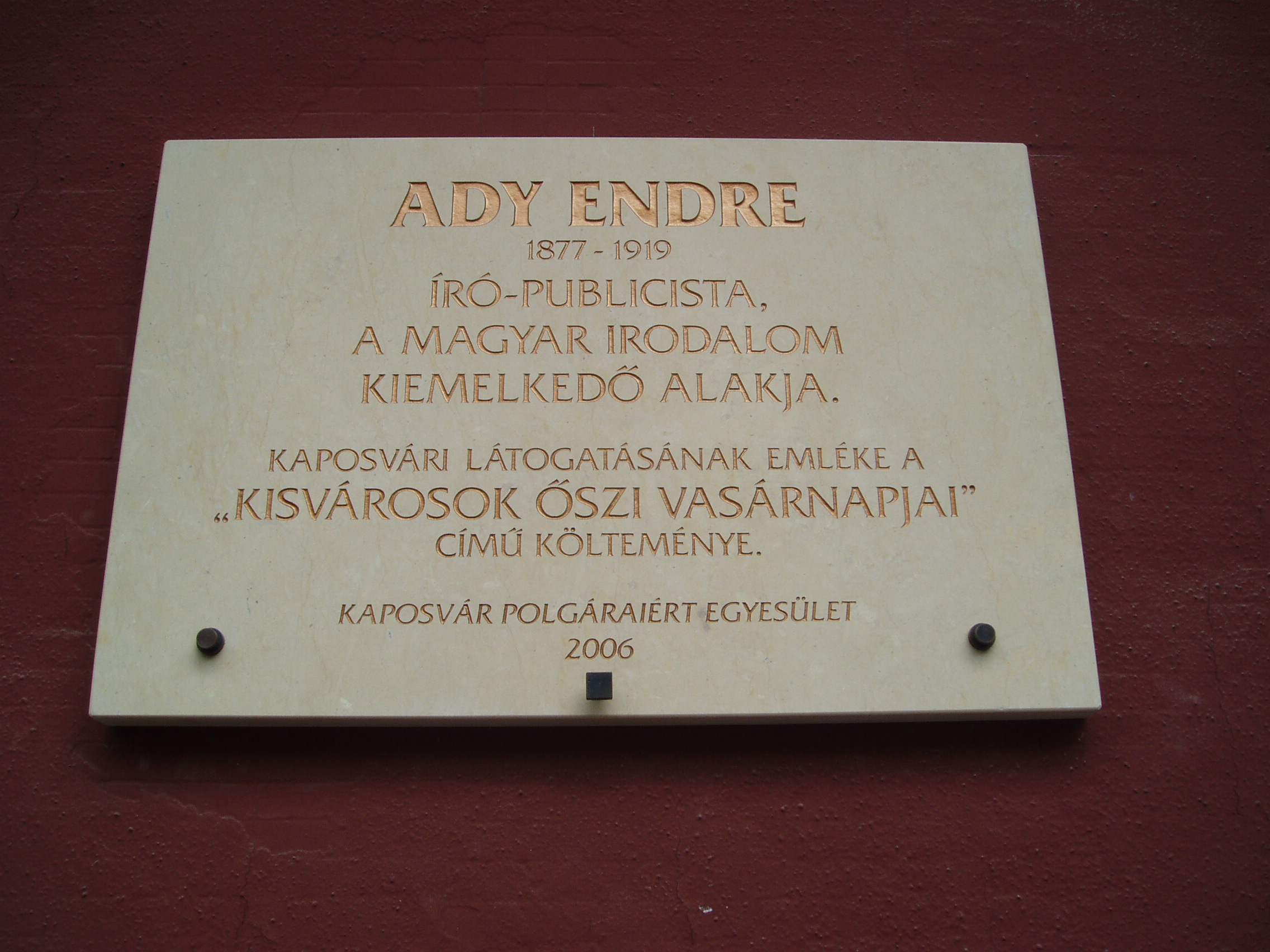 Nyilvános 1253 | 2093 | Kaposvár, Ady utca 2. | A város szívében, a mai Kapos szálloda helyén egykor urasági szálloda állott, amelyet Koronának neveztek. 1860 körül jelentősen bővítették az épületet, majd 1912-ben részben lebontották és teljesen átalakították. A mai jellegtelen épület elődeivel építészetileg semmilyen rokonságot nem mutat. Jelenleg Kapos Szálló néven működik. Egy szöveges és egy domborműves tábla Ady Endre emlékét idézi, aki egykor a Koronában tartott felolvasóestet és itteni élményei alapján írta a „Kisvárosok őszi vasárnapjai” című versét. A XIX. század közepétől a szálloda a város társadalmi és kulturális központja volt. Az 1860-as, 1870-es években, a téli időszakban — állandó színház hiányában — általában itt léptek fel a városba látogató színtársulatok. Itt (is) muzsikált Szimplicisszimusz, a világot járt híres cigányprímás, akit Ausztriából 1872-ben hívtak haza, Kaposvárra. Vendégszerepelt itt zenekarával 1895 nyarán Dankó Pista. A fénykép 2006 márciusában készült. Felh. irod.: Zádor Mihály: Kaposvár. Bp. Műszaki Kiadó, 1964 Látnivalók Somogy megyében. Miskolc, Well-PRess, 2000 |