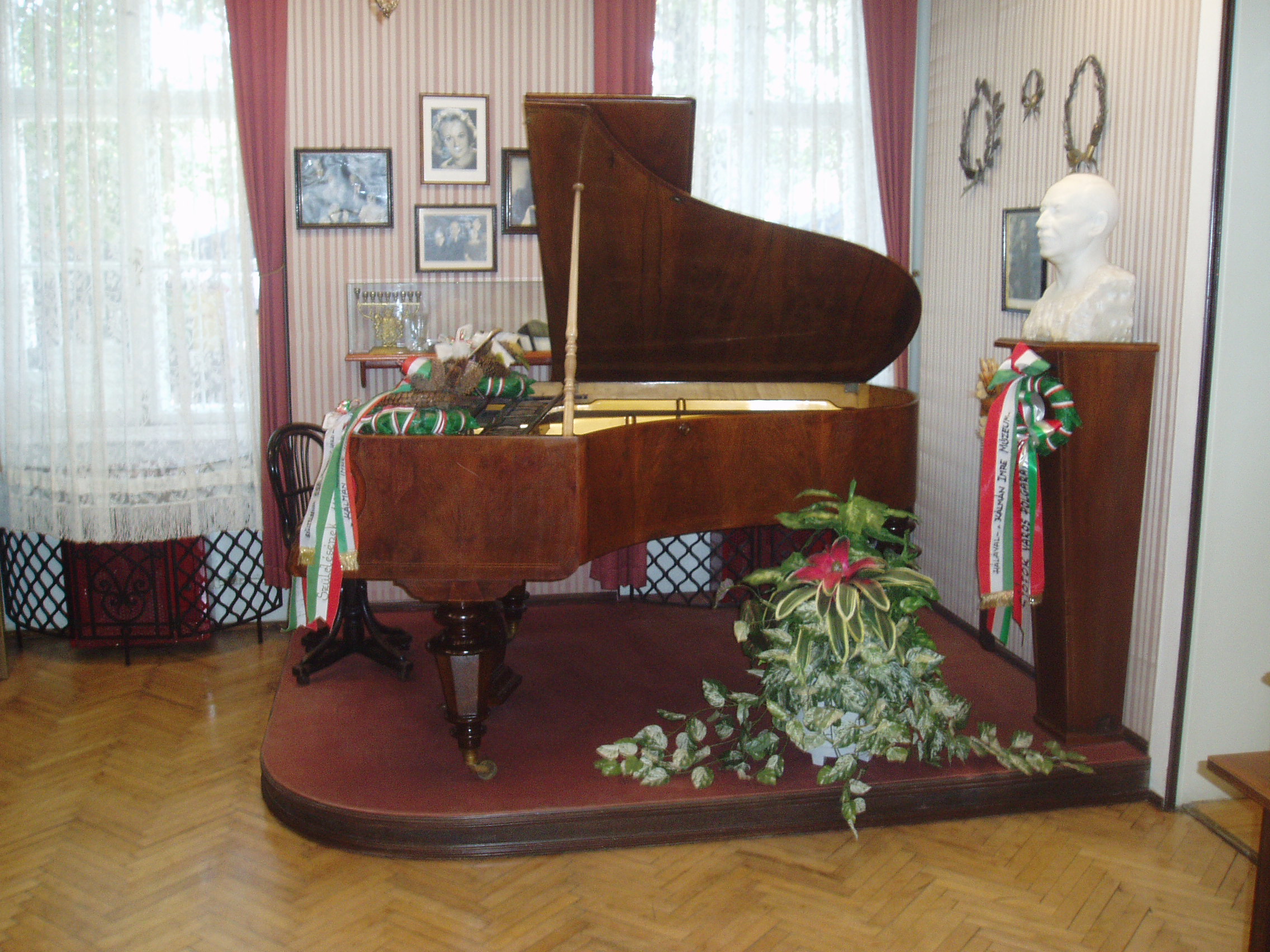 Nyilvános 1253 | 2094 | Siófok, Kálmán Imre sétány 5. | Ebben a vasútállomáshoz közeli házban született 1882-ben a magyar operett egyik legjelentősebb zeneszerzője, Kálmán Imre. Szülőházában — amelyet először 1955-ben jelöltek meg emléktáblával — 1970-ben özvegye, Kálmán Vera jelenlétében emlékszobát avattak. A mostani, gazdagabb anyagú emlékmúzeumot a zeneszerző születésének 105. évfordulója alkalmából, 1987. október 22-én nyitották meg. Jelenleg az emlékmúzeum a szülőház földszinti termeiben található, az emeleten kortárs képzőművészeti időszaki kiállításokat szoktak rendezni. Az első szoba hűen tükrözi azt a kort, amelyben az operett leendő kiválósága gyermekként, ifjúként élt. Itt látható az a Csupor gyártmányú zongora, amelyet tizenhat éves korában használtan vett összekuporgatott pénzéből, s annyira a szívéhez nőtt, hogy sohasem adta el. Ebben a teremben áll a zeneszerző 1953-ban, E. D. Minazzoli által carrarai márványból készített mellszobra. A fénykép 2006 júliusában készült. Felh. irod.: Kálmán Imre Múzeum Siófok. Szerk. Koch József. Siófok, 2000 http://www.kalmanimre-muzeum.hu/ |