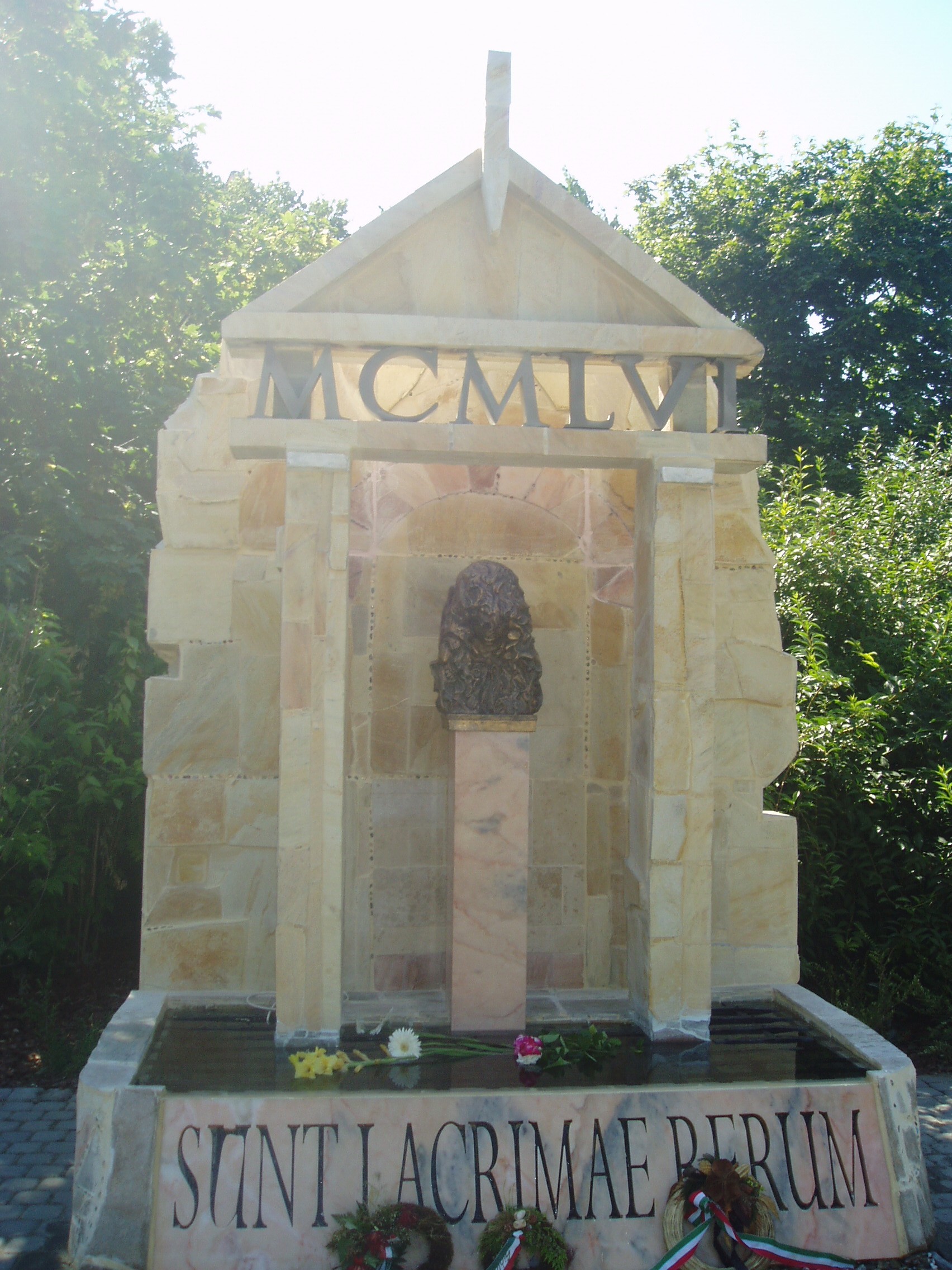 Nyilvános 1158 | 2153 | Siófok, Millennium park: 1956-os emlékmű | Az 1920-ban épült, hajdani pompájában felújított állomásépület előtt 1994-ben készült el a 16 ezer négyzetméteres Millennium park. Gyönyörű pázsit, különleges cserjék, virágok, szobrok, tavacska, este díszkivilágítás ékesíti a területet. Itt állították fel 1956 ötvenedik évfordulóján a város 56-os emlékművét, Varga Tamás: Könnyek kútja című alkotását. Varga Tamás szobrászművész Siófokon született, ahol már több szobra is áll. A Könnyek kútja című műalkotás középpontjában egy könnyező női arcot formázott, emlékeztetve arra, hogy 1956 után tilos volt az erkölcsi megemlékezés, sőt még sírni sem volt szabad. A felirat - "Sunt lacrymae rerum" - Vergilius: Aeneis című eposzából származik. Magyar fordítása: Van a tárgyaknak könnye. A fénykép 2006 júliusában készült. Felh. irod.: http://www.siofok.hu/szobor_konnyek_kutja.php |