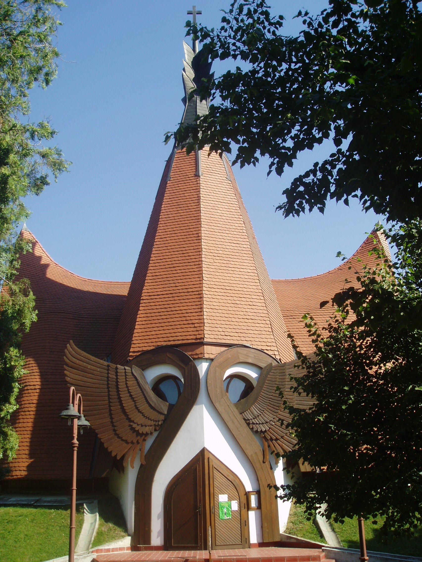 Nyilvános 1177 | 2302 | Siófok, Oulu park: Evangélikus templom | A Siófok finn testvérvárosáról elnevezett parkban található az ország legszebb és legmodernebb evangélikus temploma. Építéséhez a finn testvérváros evangélikus gyülekezete is jelentősen hozzájárult. Az építészetileg igazi különlegességnek számító, a népi építészet hagyományait a legmodernebb eszközökkel ötvöző templom Makovecz Imre tervei alapján 1990-ben épült. Ezen az épületen is, mint Makovecz legtöbb alkotásán a fa - mint természetes építőanyag - dominál. A torony tetején, az életfából kinövő kereszt azt jelképezi, hogy a golgotai kereszt nem a halálé, hanem utat mutat az örök élethez. A négykapus, 120 férőhelyes templom főbejárata fölött angyalszárnyak vigyázzák a belépőt. A keleti tájolású oltár fölött Péterffy László: A feltámadott szobra című alkotása látható. A templom 2004-ben az Aquincumi Orgonagyár által készített hangversenyorgonával gazdagodott. A fénykép 2006 júliusában készült. Felh. irod.: www.vendegvaro.hu Orgonaépítés a siófoki Makovecz-templomban. = Evangélikus Élet 2004. 9. |