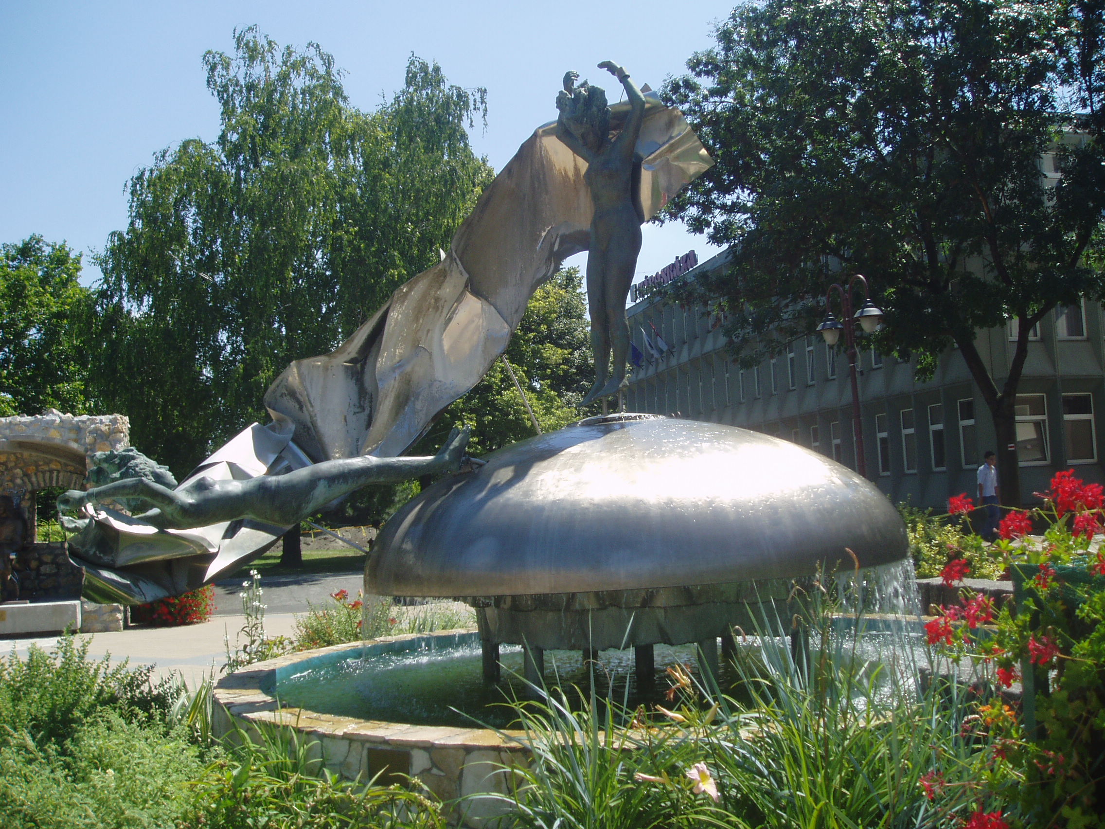 Nyilvános 1246 | 2830 | Siófok, Fő tér: Varga Imre: Vénusz születése | Varga Imre szobrászművész 1923. november 1-jén született Siófokon. Már gyermekkorában - a siófoki elemi iskolában - rendkívül jó rajzkészségével tűnt ki. 13 évesen szerepelt egy képével Párizsban. A képzőművészet terén elért kimagasló érdemeiért, amellyel Magyarország és Siófok város hírnevét is öregbítette, 1985-ben ő lett Siófok város első díszpolgára. Hazai és külföldi tereken, templomokban, középületekben mintegy 300 alkotását helyezték el. Szobrai állnak Belgiumban, Franciaországban, Lengyelországban, Németországban, Norvégiában és Izraelben. Siófokon a Fő téren szabadtéri szoborkiállítása látható. 1988-ban készült alkotása, a "Vénusz születése" a víz, a nap és a szél hármas egységét jeleníti meg. A fénykép 2006 júliusában készült. Felh. irod.: http://www.siofok.com/uj/object/varga-hu.html http://www.siofok.hu/szobor_venusz_szuletese.php |
