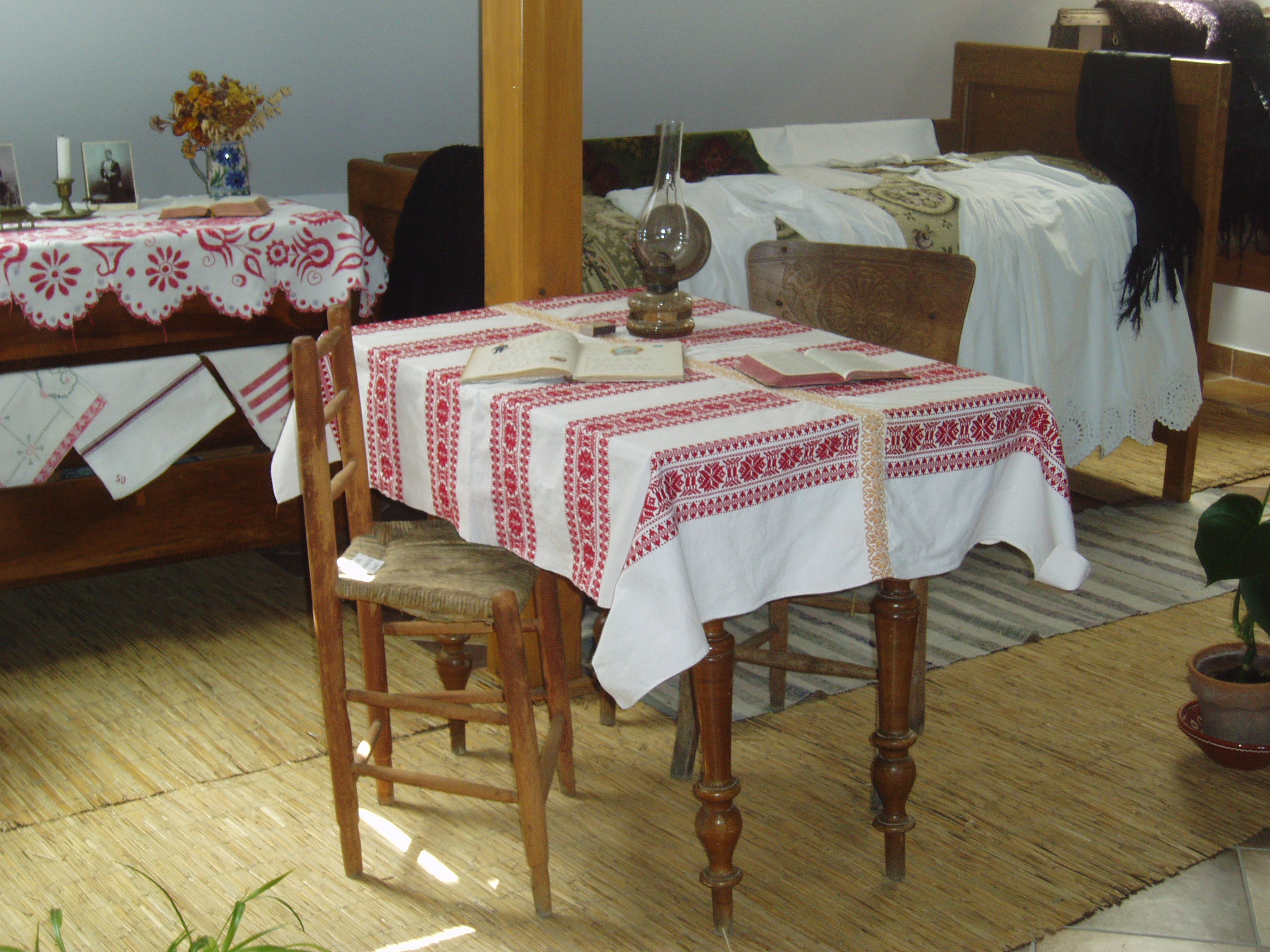 Nyilvános 1162 | 1909 | Fonyód, Bartók Béla utca 3. Természetvédelmi és Helytörténeti Múzeum | A fonyódi Várhegyen kialakult Bélatelephez tartozó, a Balaton egyik legszebb panorámájú helyén álló villát az orvosi doktorátussal rendelkező, többek között Kelet-kutatóként is számon tartott lászlófalvi Velics Antal (1875-1915) építtette az 1900-as évek elején. Ebben a villában töltötte 1916 és 1917 nyarát Szinyei Merse Pál, hazánk egyik legkiválóbb festőművésze. Balatoni tartózkodása idején hozzávetőleg tíz fetményt alkotott. Az épület az 1980-as évek végéig moziként üzemelt. Felújítása után, 2004-ben nyílt meg termeiben a fonyódi Természetvédelmi és Helytörténeti Múzeum. Benne a Fonyód történetét és néprajzát bemutató állandó kiállítás mellett időszaki kiállításokat is rendeznek. A képen a néprajzi kiállításrész látható. A fénykép 2007 júliusában készült. Felh. irod.: http://muzeum.fonyod.hu/ |