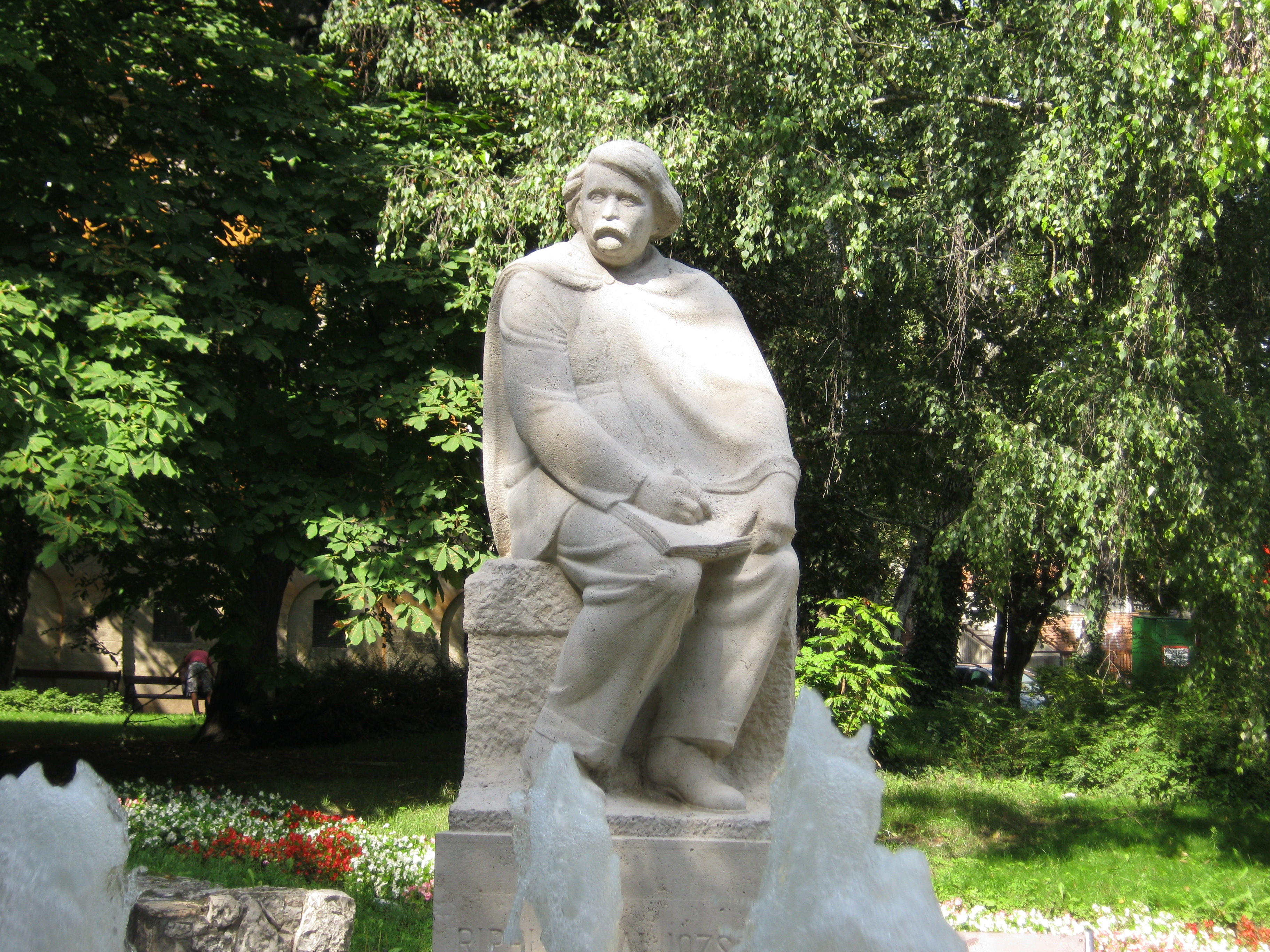 Nyilvános 1113 | 2011 | Kaposvár, Rippl-Rónai tér: Rippl-Rónai József szobra | Medgyessy Ferenc 1930-ban készített szobrát 1950-ben állították fel a festőművészről elnevezett téren. A posztimpresszionista és szecessziós törekvések legkiemelkedőbb magyarországi képviselőjeként számon tartott Rippl-Rónai József eredetileg Kaposváron patikussegédnek tanult (lásd: Kaposvár, Fő u. 19.). Művészi munkássága Párizsban, Munkácsy Mihály tanítványaként bontakozott ki. 1902-ben visszatért Kaposvárra, az I. világháború kitörése azonban ismét Párizsban érte, ahol elfogták és internálták. 1915-ben ismét visszatért a szülővárosába, és haláláig a jelenleg múzeumként látogatókat fogadó Róma-villa (lásd: Kaposvár, Róma hegy) volt az otthona. A fénykép 2010 augusztusában készült. |
