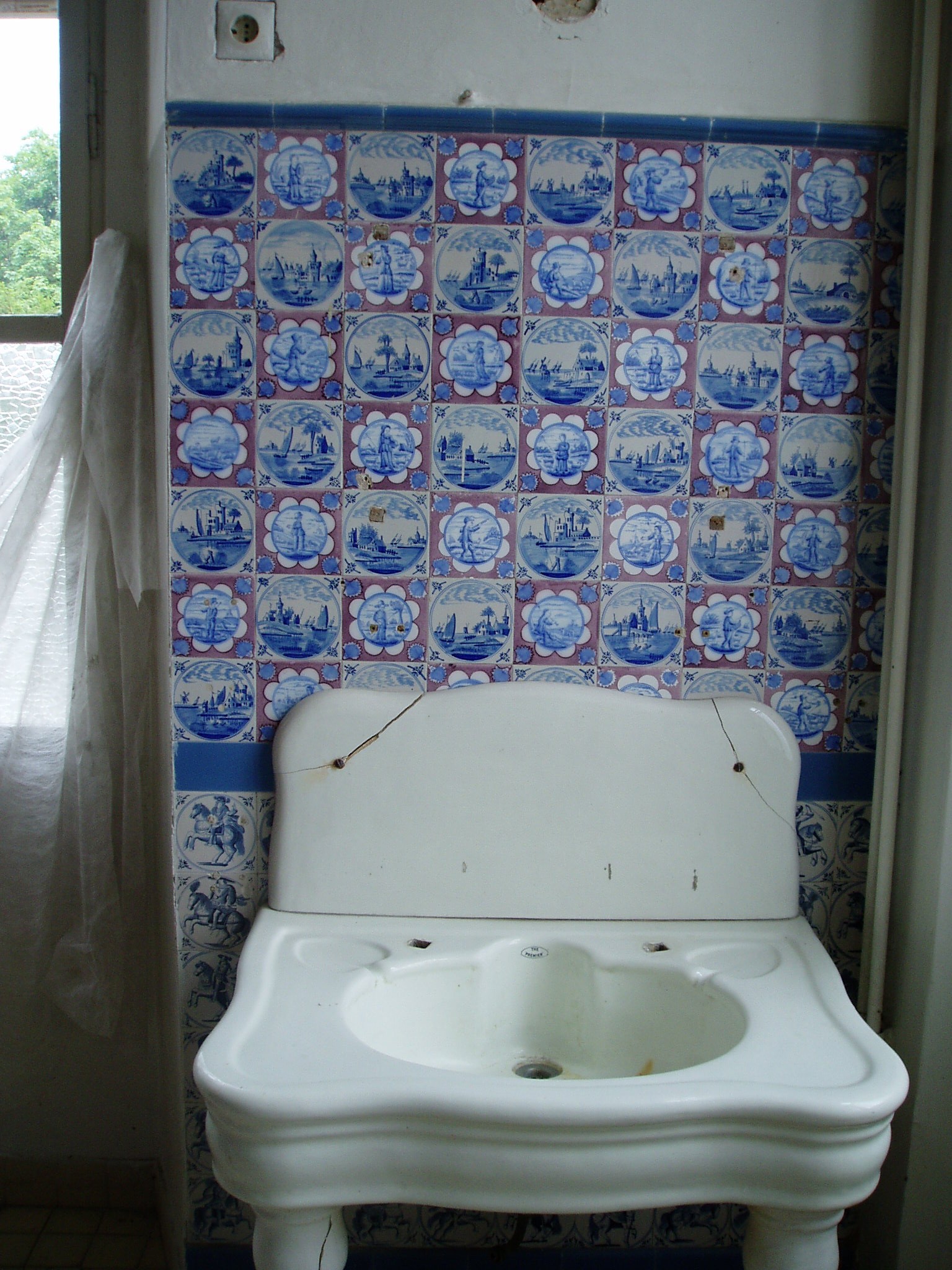 Nyilvános 1533 | 3430 | Tata, Kastély tér: Esterházy-kastély | Az Esterházy–kastély műemléki együttese az Öreg–tó partján, a középkori vár közvetlen szomszédságában áll. Fellner Jakab tervei szerint a XVIII. század második felében épült az Esterházy–család fraknói ága számára, későbarokk stílusban, a kiváló építész egyik legjelentősebb műveként. Fellner a hazai késő barokk, illetve korai klasszicizmus egyik legjelentősebb építésze, munkássága a mai napig meghatározza Tata városképét. Az épület több alkalommal is jelentős szerepet játszott a történelemben. 1809-ben I. Ferenc osztrák császár és felesége, Ludovika ide menekültek Napóleon hadai elől. Hosszú hetekig itt laktak, s az uralkodó itt, az északi szárny toronyszobájában írta alá az ún. Schönbrunni békét. 1897-ben Ferenc József és II. Vilmos német császár látogattak ide egy tatai hadgyakorlat alkalmából. 1921-ben az utolsó magyar király, IV. Károly menekült ide feleségével a balul végződött budaörsi csata után, s itt vették őket őrizetbe. A kastély eredeti berendezését sajnos széthordták, de épségben megmaradtak korabeli belsőépítészeti szerkezetei: kosáríves záródású ablakai, festett ajtói, díszes spalettái, stukkói és festett mennyezetei. A képen a XIX. század végén kialakított hollandi csempés fürdőszoba látható. Falait kézzel festett csempék borítják, s köztük nincs kettő egyforma mintázatú. A fénykép 2005. júliusában készült. Felh. irod.: Polgárdy Géza: Tatatóváros és környéke kalauza. Az 1939-es kiadás reprintje. Tata, Móricz Zsigmond Városi Könyvtár, 1998 Magyar kastélylexikon 4. Komárom-Esztergom megye kastélyai és kúriái. Bp. Perfect Project, 2003 |