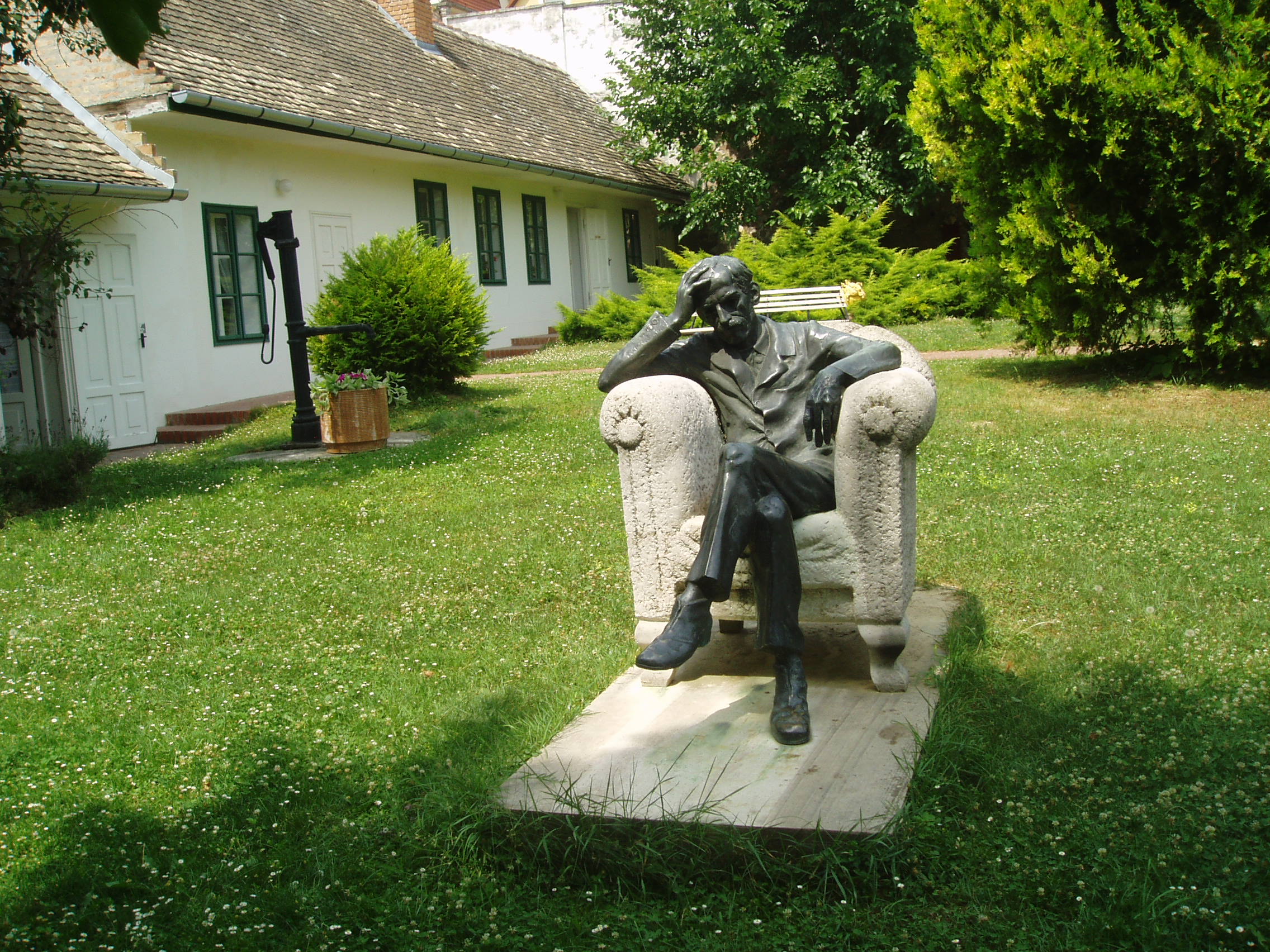 Nyilvános 1621 | 3629 | Szekszárd, Babits Mihály utca 13. Babits Mihály Emlékház | Babits Mihály egyemeletes, copf stílusú szülőháza a XIX. század elején (egyes források szerint 1780 körül) épült az akkor a város védőszentjéről Szt. Lászlónak nevezett utcában. A költő anyai nagyapja 1852-ben, szekszárdi letelepedésekor vásárolta meg. Itt született a költő 1883. november 26-án, s sokat tartózkodott és alkotott ezen a helyen. 1967-ben rendezték meg a házban az első emlékkiállítást, amelyet 1983-ban, a költő születésének centenáriumán újjáalakítottak, s az egész épületet emlékháznak rendezték be. A költő relikviái, a család bútorai, használati tárgyai és dokumentumai mellett láthatók Farkas Pál, Rippl-Rónai József, Glatz Oszkár és Beck Ö. Fülöp Babitsot ábrázoló képzőművészeti alkotásai is. Babits Mihály számos verse itt született, és itt játszódik a Halálfiai című regény több fejezete is. Az épület udvarán 1981-ben avatták fel Babits Mihály szobrát, Farkas Pál alkotását. A töprengő költő szobra a szülőház elválaszthatatlan része lett. Babits szülőházában állandó kiállítás idézi a szintén szekszárdi születésű Dienes Valéria filozófus és Baka István költő, író emlékét. A fénykép 2006 júliusában készült. Felh. irod.: www.szekszard.hu www.museum.hu Töttős Gábor: Babits bölcsői körül. = Tolna Megyei Levéltári Füzetek 6. Szekszárd, 1977 |
