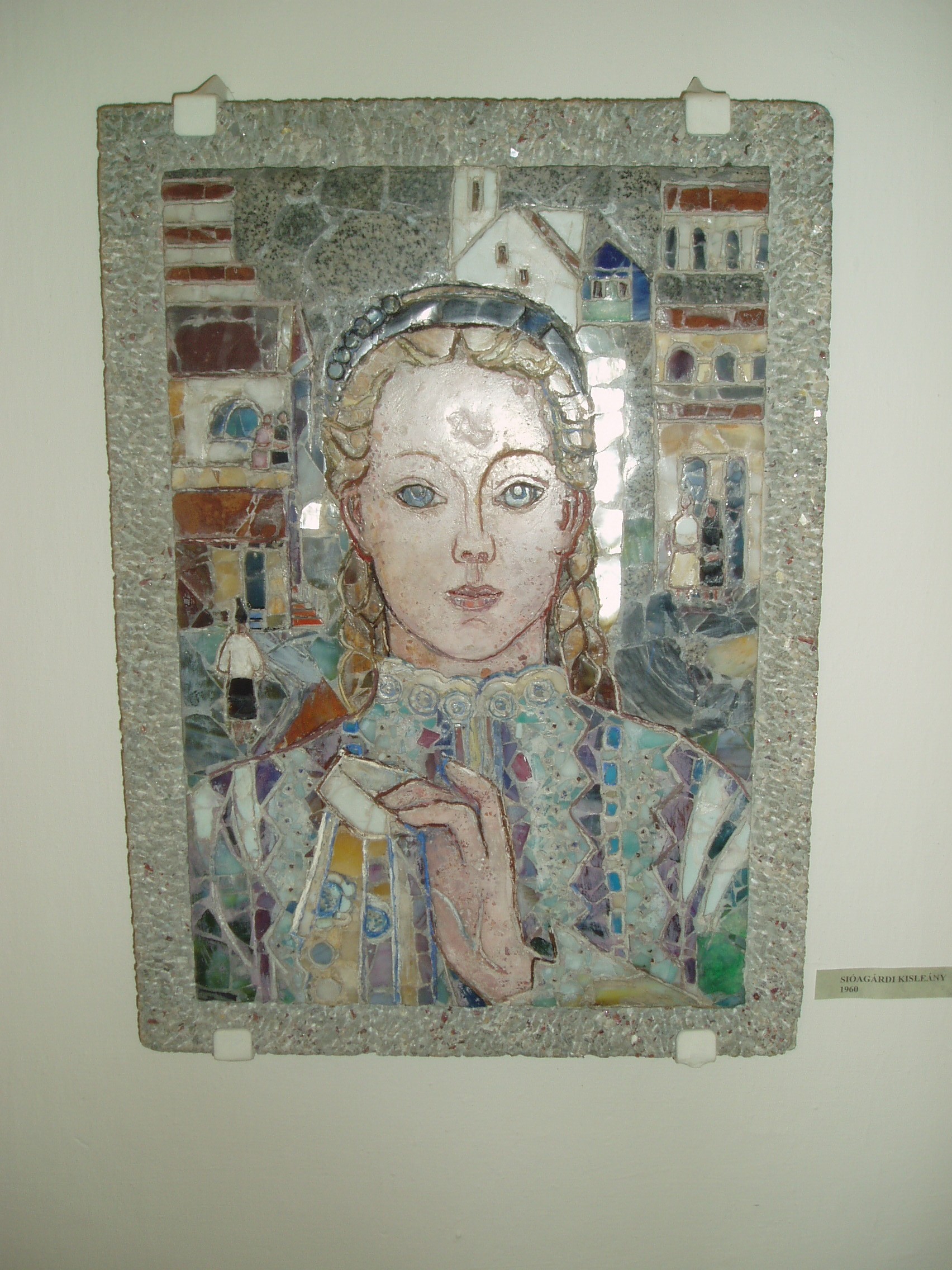 Nyilvános 1152 | 1857 | Szekszárd, Béla tér 1. | A szekszárdi Megyeházán állandó kiállításon láthatók Mattioni Eszter (1902-1993) művei. A kiállítás anyagát azok a képek alapozták meg, amelyeket 1981-ben ajándékozott szülővárosának. Irodalomtörténeti érdekesség, hogy Mattioni Eszter nagymamája az a Sass Erzsike volt, akivel Petőfi csillagot választott a négyökrös szekéren... Az olasz származású Mattioni Eszter 1902-ben született Szekszárdon. Olasz édesapja selyemhernyótenyésztési szakembernek jött Magyarországra. Édesanyja Szekszárdon volt óvónő abban az óvodában, amelyet egykor Brunszvik Teréz alapított. Mattioni Eszter alkotta meg az általa hímeskőnek elnevezett technológiát, mely a klasszikus mozaik XX. századi változata: az egyformára vágott üveghasábok, kőzúzalékok helyett az ábra formáinak megfelelő, különböző méretű színes márványdarabokat, féldrágaköveket ágyaz cementbe. A képen egy ezzel a technológiával készült leányportréja látható. A fénykép 2006 júliusában készült. Felh. irod.: www.szekszard.hu Mattioni Eszter. Szekszárd, Wosinszky Mór Megyei Múzeum, 1990 |