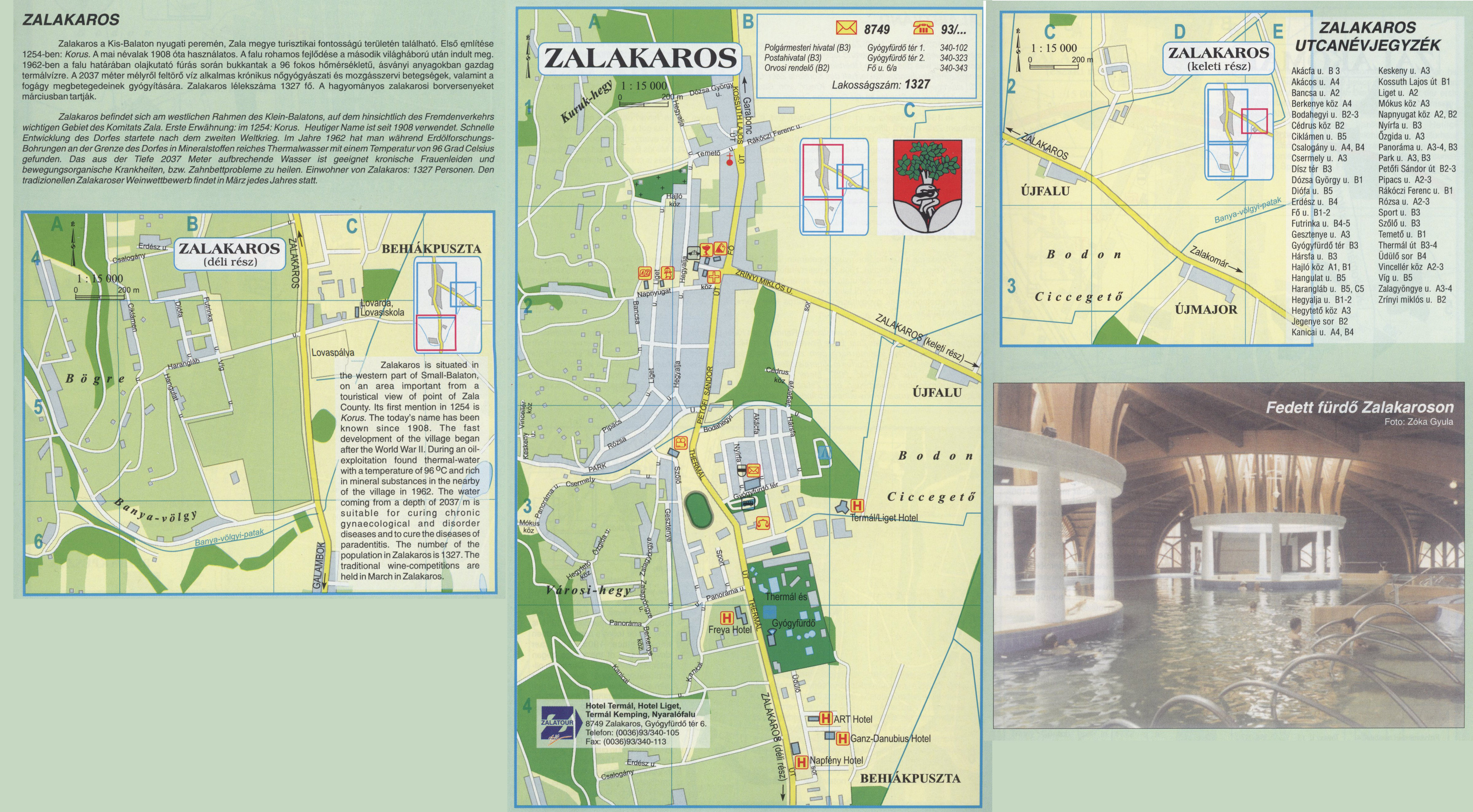 Nyilvános 1980 | 6423 | ZALAKAROS | Zalakaros a Kis-Balaton nyugati peremén, Zala megye turisztikai fontosságú területén található. Első említése 1254-ben: Korus. A mai névalak 1908 óta használatos. A falu rohamos fejlődése a második világháború után indult meg. 1962-ben a falu határában olajkutató fúrás során bukkantak a 96 fokos hőmérsékletű, ásványi anyagokban gazdag termálvízre. A 2037 méter mélyről feltörő víz alkalmas krónikus nőgyógyászati és mozgásszervi betegségek, valamint a fogágy megbetegedéseinek gyógyítására. Zalakaros lélekszáma 1327 fő. A hagyományos zalakarosi borversenyeket márciusban tartják. Zalakaros befindet sich am westlichen Rahmen des Klein-Balatons, auf dem hinsichtlich des Fremdenverkehrs wichtigen Gebiet des Komitats Zala. Erste Erwähnung: im 1254: Korus. Heutiger Name ist seit 1908 verwendet. Schnelle Entwicklung des Dorfes startete nach dem zweiten Weltkrieg. Im Jahre 1962 hat man während Erdölforschungs-Bohrungen an der Grenze des Dorfes in Mineralstoffen reiches Thermalwasser mit einem Temperatur von 96 Grad Celsius gefunden. Das aus der Tiefe 2037 Meter aufbrechende Wasser ist geeignet kronische Frauenleiden und bewegungsorganische Krankheiten, bzw. Zahnbettprobleme zu heilen. Einwohner von Zalakaros: 1327 Personen. Den tradizionellen Zalakaroser Weinwettbewerb findet in März jedes Jahres statt. Zalakaros is situated in the western part of Small-Balaton, on an area important from a touristical view of point of Zala County. Its first mention in 1254 is Korus. The today\'s name has been known since 1908. The fast development of the village began after the World War II. During an oil-exploitation found thermal-water with a temperature of 96 °C and rich in mineral substances in the nearby of the village in 1962. The water coming from a depth of 2037 m is suitable for curing chronic gynaecological and disorder diseases and to cure the diseases of paradentitis. The number of the population in Zalakaros is 1327. The traditional wine-competitions are held in March in Zalakaros. A részlet a következő kiadványból származik/Die Teile stammen vom volgenden Buch/This text came from the following book: Cím/Titel/Title: Zala megye településeinek atlasza - 257 település részletes térképe/Atlas der Komitat Zala - 257 Detailte Siedlungskarten/Zala county\'s Atlas - 257 settlement maps. Közreműködő/contributor: Lackner László (1943) (fotó) Kiadás/Ausgabe/Publisher: Gyula : HISZI-MAP, 1997 Sorozat/Serie/Series: Indulástól - megérkezésig... ETO: 912(439.121-2) ; 908.439.121 Cutter: Z 19 ISBN: 963-610-025-4 Oldalszám/Seiten/Pages: 323, 81 p. Megjegyzés/Note: Lezárva/Abgeschlossen am/Closed am: 1997. máj. 30. |