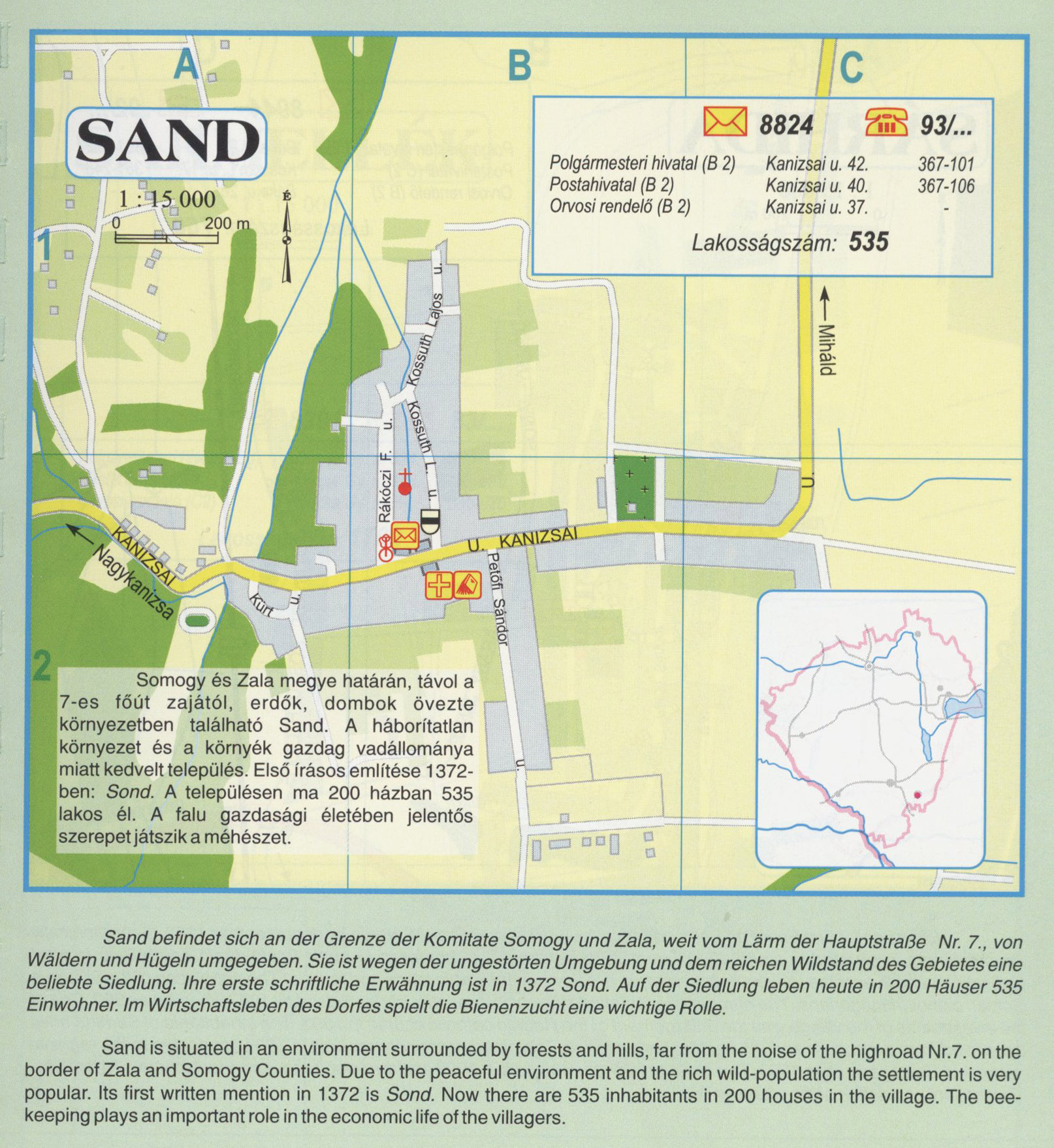 Nyilvános 2509 | 9395 | Sand | Somogy és Zala megye határán, távol a 7-es főút zajától, erdők, dombok övezte környezetben található Sand. A háborítatlan környezet és a környék gazdag vadállománya miatt kedvelt település. Első írásos említése 1372-ben: Sond. A településen ma 200 házban 535 lakos él. A falu gazdasági életében jelentős szerepet játszik a méhészet. Sand befindet sich an der Grenze der Komitate Somogy und Zala, weit vom Lärm der Hauptstraße Nr. 7., von Wäldern und Hügeln umgegeben. Sie ist wegen der ungestörten Umgebung und dem reichen Wildstand des Gebietes eine beliebte Siedlung. Ihre erste schriftliche Erwähnung ist in 1372 Sond. Auf der Siedlung leben heute in 200 Häuser 535 Einwohner. Im Wirtschaftsleben des Dorfes spielt die Bienenzucht eine wichtige Rolle. Sand is situated in an environment surrounded by forests and hills, far from the noise of the highroad Nr.7. on the border of Zala and Somogy Counties. Due to the peaceful environment and the rich wild-population the settlement is very popular. Its first written mention in 1372 is Sond. Now there are 535 inhabitants in 200 houses in the village. The bee-keeping plays an important role in the economic life of the villagers. A részlet a következő kiadványból származik/Die Teile stammen vom volgenden Buch/This text came from the following book: Cím/Titel/Title: Zala megye településeinek atlasza - 257 település részletes térképe/Atlas der Komitat Zala - 257 Detailte Siedlungskarten/Zala county\'s Atlas - 257 settlement maps. Közreműködő/contributor: Lackner László (1943) (fotó) Kiadás/Ausgabe/Publisher: Gyula : HISZI-MAP, 1997 Sorozat/Serie/Series: Indulástól - megérkezésig... ETO: 912(439.121-2) ; 908.439.121 Cutter: Z 19 ISBN: 963-610-025-4 Oldalszám/Seiten/Pages: 323, 81 p. Megjegyzés/Note: Lezárva/Abgeschlossen am/Closed am: 1997. máj. 30. |