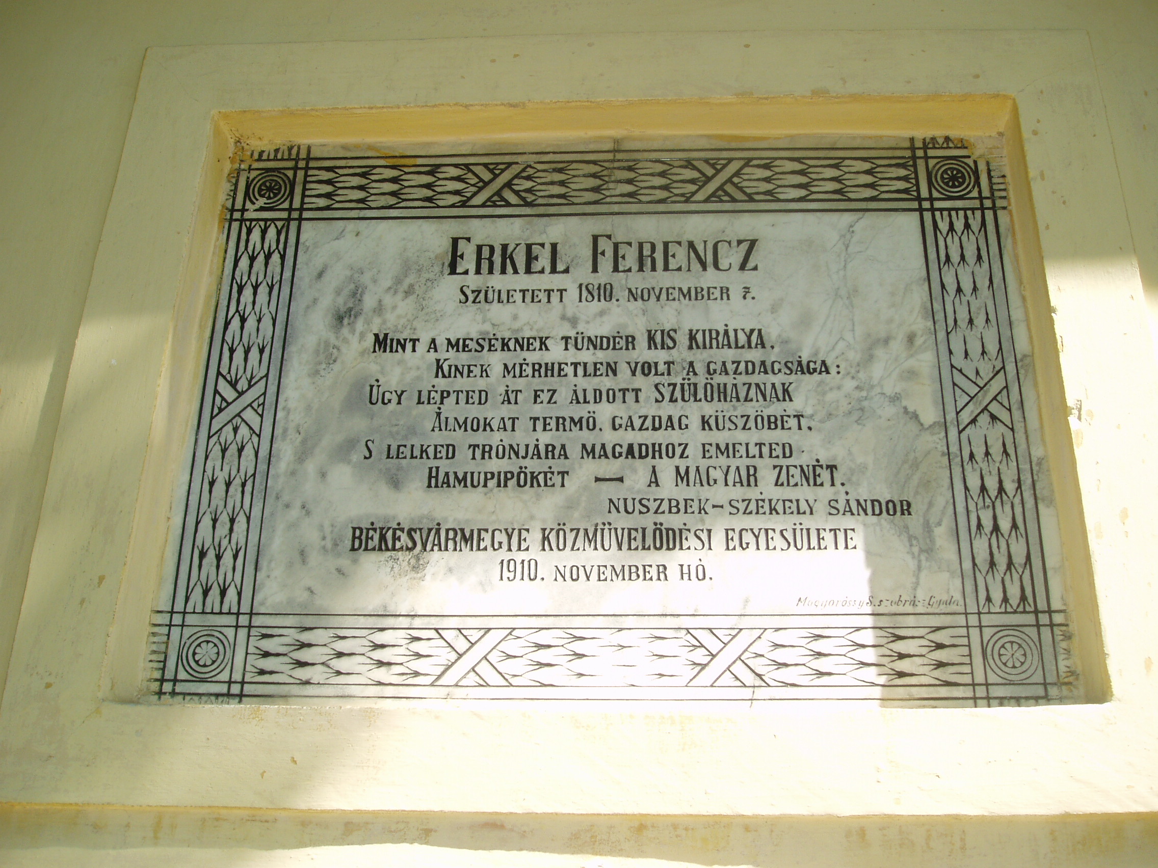 Nyilvános 1436 | 3043 | Gyula, Apor tér 7. Erkel Ferenc szülőháza | A földszintes, klasszicista jellegű németgyulai iskola és kántortanítói lakás 1795-ben épült. Az L alakú épület Apor térre néző szárnya volt az iskola, a Dürer utcára néző pedig a tanítói lakás, melynek ablakai közül kettő a térre néz. Ebben a házban született 1810. november 7-én Erkel Ferenc a németgyulai tanító fiaként, s testvéreivel együtt itt nevelkedett szeretetteljes családi légkörben. Első zenei tanítója remekül muzsikáló édesapja volt. Már néhány héttel Erkel halála után, 1893. július 5-én a házat emléktáblával jelölték meg, amelyet 1910-ben, születésének centenáriumán a képen is látható díszesebbre cserélték. A korábbi tantermek helyén először 1960-ban rendeztek kiállítást, majd 1970-ben nyílt meg az Erkel Ferenc Emlékmúzeum. 1985-ben kibővítették, múzeumnak rendezték be az eredeti tanítói lakás helyiségeit is, köztük azt a sarokszobát, amelyben Erkel született. Az Emlékház gyűjteményében megtekinthetőek az Erkel család relikviái, s itteni életkörülményeikbe is bepillanthat a látogató. A fénykép 2007 júliusában készült. Felh. irod.: Czeglédi Imre: Gyula útikalauz. 2. bőv. kiad. Gyula, 1995 Czeglédi Imre: Erkel Ferenc Emlékház /Tájak, korok, múzeumok 238./ Németh Csaba: A gyulai Erkel Ferenc Múzeum Erkel–gyűjteménye. Gyula, 2007. /Gyulai katalógusok 12./ |