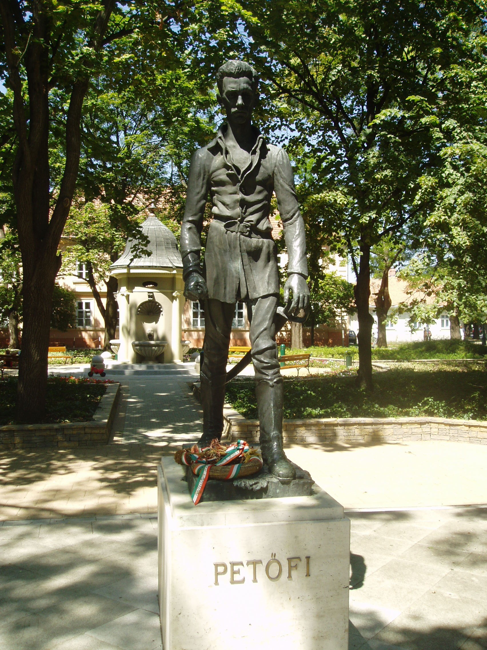 Nyilvános 1090 | 2669 | Gyula, Petőfi tér: Petőfi Sándor szobra | A városközponti háromszög alakú hangulatos tér csaknem minden épülete történelmi vagy műemléki érték. A tér közepén Petőfi Sándor egészalakos szobra áll. Leleplezésekor, 1960-ban sokat vitatták az alkotást, mára azonban a legjobb Petőfi-ábrázolások között tartják számon Ferenczy Béni művét. A fénykép 2007 júliusában készült. Felh. irod.: Czeglédi Imre: Gyula útikalauz. 2. jav., bőv. kiad. Gyula, 1995 |