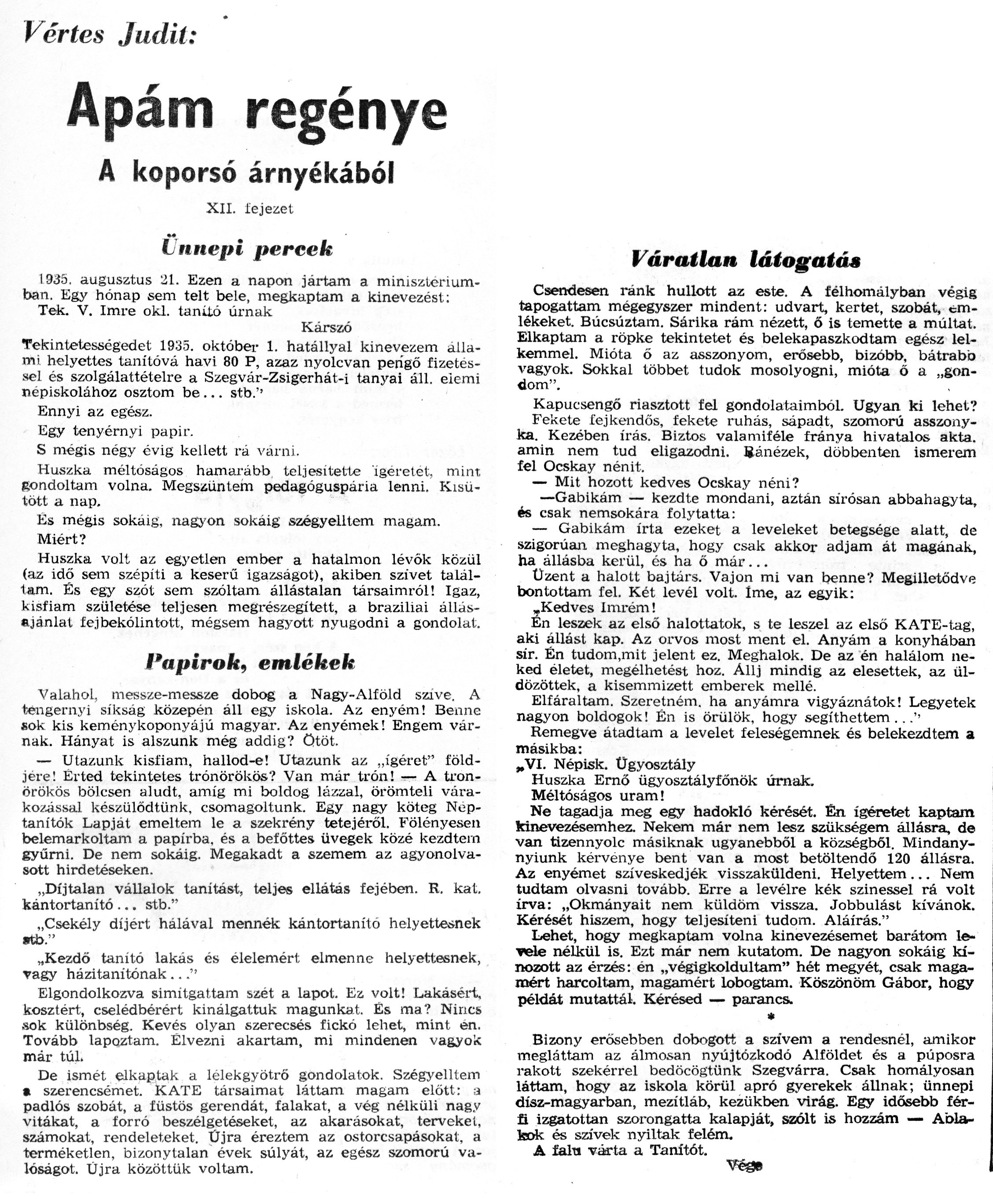 Nyilvános 1191 | 2204 | Zalai Hírlap 1971.03.21. 068sz 08old - Apám regénye 12 | A következő szöveg a cikkből keletkezett automata szövegfelismertető segítségével: Vértes Judit: Apám regénye A koporsó árnyékából XII. fejezet Ünnepi percek 1935. augusztus 21. Ezen a napon jártam a minisztériumban. Egy hónap sem telt bele, megkaptam a kinevezést: Tek. V. Imre oki. tanító úrnak Kárszó Tekintetességedet 1935. október 1. hatállyal kinevezem állami, helyettes tanítóvá havi 80 P, azaz nyolcvan pengő fizetéssel és szolgálattételre a Szegvár-Zsigerhát-i tanyai áll. elemi népiskolához osztom be... stb.\'1 Ennyi az egész. . . Egy tenyérnyi papir. S mégis négy évig kellett ra várni. Huszka méltóságos hamarább teljesítette ígéretet, mint gondoltam volna. Megszűntem pedagóguspária lenni. Kisütött a nap. És mégis sokáig, nagyon sokáig szégyelltem magam. Miért? Huszka volt az egyetlen ember a hatalmon lévók közül (az idő sem szépíti a keserű igazságot), akiben szivet találtam. És egy szót sem szóltam, állástalan társaimról! Igaz, kisfiam születése teljesen megrészegített, a braziliai állásajánlat fejbekólintott, mégsem hagyott nyugodni a gondolat. Papírok, emlékek Valahol, messze-messze dobog a Nagy-Alíöld szive. A tengernyi síkság közepén áll egy iskola. Az enyém! Benne sok. kis keménykoponyájú magyar. Az enyémek! Engem várnak. Hányat is alszunk még addig? ötöt. — Utazunk kisfiam, hallod-e! Utazunk az „ígéret" földjére! Érted tekintetes trónörökös? Van már trón! — A trónörökös bölcsen aludt, amíg mi boldog lázzal, örömteli várakozással készülődtünk, csomagoltunk. Egy nagy köteg Néptanítók Lapját emeltem le a szekrény tetejéről. Fölényesen belemarkoltam a papírba, és a beíőttes üvegek közé kezdtem gyűrni. De nem sokáig. Megakadt a szemem az agyonolvasott hirdetéseken. „Díjtalan vállalok tanítást, teljes ellátás fejében. R. kat. kántortanító ... stb." „Csekély díjért hálával mennék kántortanító helyettesnek «ü>." „Kezdő tanító lakás és élelemért elmenne helyettesnek, vagy házitanitónak ..." Elgondolkozva simitgattam szét a lapot. Ez volt! Lakásért, kosztért, cselédbérért kinálgattuk magunkat. És ma? Nincs sok különbség. Kevés olyan szerecsés fickó lehet, mint én. Tovább lapoztam. Élvezni akartam, mi mindenen vagyok már túl. De ismét elkaptak a lélekgyötrő gondolatok. Szégyelltem • szerencsémet. KATE társaimat láttam magam előtt: ;a padlós szobát, a füstös gerendát, falakat, a vég nélküli nagy vitákat, a forró beszélgetéseket, az akarásokat, terveket, számokat, rendeleteket. Üjra éreztem az ostorcsapásokat, a terméketlen, bizonytalan évek súlyát, az egész szomorú valóságot. Üjra közöttük voltam. Váratlan látogatás Csendesen ránk hullott az este. A félhomályban végig tapogattam mégegyszer mindent: udvart, kertet, szobát, emlékeket. Búcsúztam. Sárika rám nézett, ő is temette a múltat. Elkaptam a röpke tekintetet és belekapaszkodtam egész lel-kemmel. Mióta ő az asszonyom, erősebb, bizóbb, bátrabb vagyok. Sokkal többet tudok mosolyogni, mióta ő a „gondom". Kapucsengő riasztott fel gondolataimból. Ugyan ki lehet? Fekete fejkendős, fekete ruhás, sápadt, szomorú asszonyka. Kezében írás. Biztos valamiféle fránya hivatalos akta. amin nem tud eligazodni. Ránézek, döbbenten ismerem fel Ocskay nénit. — Mit hozott kedves Ocskay néni? —Gabikám — kezdte mondani, aztán sirósan abbahagyta, és csak nemsokára folytatta: — Gabikám írta ezeket a leveleket betegsége alatt, de szigorúan meghagyta, hogy csak akkor adjam át magának, ha állásba kerül, és ha ö már... Üzent a halott bajtárs. Vajon mi van benne? Megilletődve bontottam fel. Két levél volt. Íme, az egyik: ,Kedves Imrém! En leszek az első halottatok, s te leszel az első KATE-tag, aki állást kap. Az orvos most ment el. Anyám a konyhában sir. Én tudom.mit jelent ez. Meghalok. De az én halálom neked életet, megélhetést hoz. Állj mindig az elesettek, az üldözöttek, a kisemmizett emberek mellé. Elfáraltam. Szeretném, ha anyámra vigyáznátok! Legyetek nagyon boldogok! Én is örülök, hogy segíthettem .. .\'• Remegve átadtam a levelet feleségemnek és belekezdtem a másikba: „VI. Népisk. Ügyosztály Huszka Ernő ügyosztályfőnök úrnak. Méltóságos uram! Ne tagadja meg egy hadokló kérését. Én ígéretet kaptam kinevezésemhez. Nekem már nem lesz szükségem állásra, de van tizennyolc másiknak ugyanebből a községből. Mindany-nyiunk kérvénye bent van a most betöltendő 120 állásra. Az enyémet szíveskedjék visszaküldeni. Helyettem ... Nem tudtam olvasni tovább. Erre a levélre kék színessel rá volt írva: „Okmányait nem küldöm vissza. Jobbulást kívánok. Kérését hiszem, hogy teljesíteni tudom. Aláírás." Lehet, hogy megkaptam volna kinevezésemet barátom levele nélkül is. Ezt már nem kutatom. De nagyon sokáig kínozott az érzés: én „végigkoldultam" hét megyét, csak magamért harcoltam, magamért lobogtam. Köszönöm Gábor, hogy példát mutattál. Kérésed — parancs. * Bizony erősebben dobogott a szivem a rendesnél, amikor megláttam az álmosan nyújtózkodó Alföldet és a púposra rakott szekérrel bedöcög\'tünk Szegvárra. Csak homályosan láttam, hogy az iskola körül apró gyerekek állnak; ünnepi dísz-magyarban, mezítláb, kezükben virág. Egy idősebb férfi izgatottan szorongatta kalapját, szólt is hozzám — Ablakok és szívek nyíltak felém. A feht várta a Tanítót. |