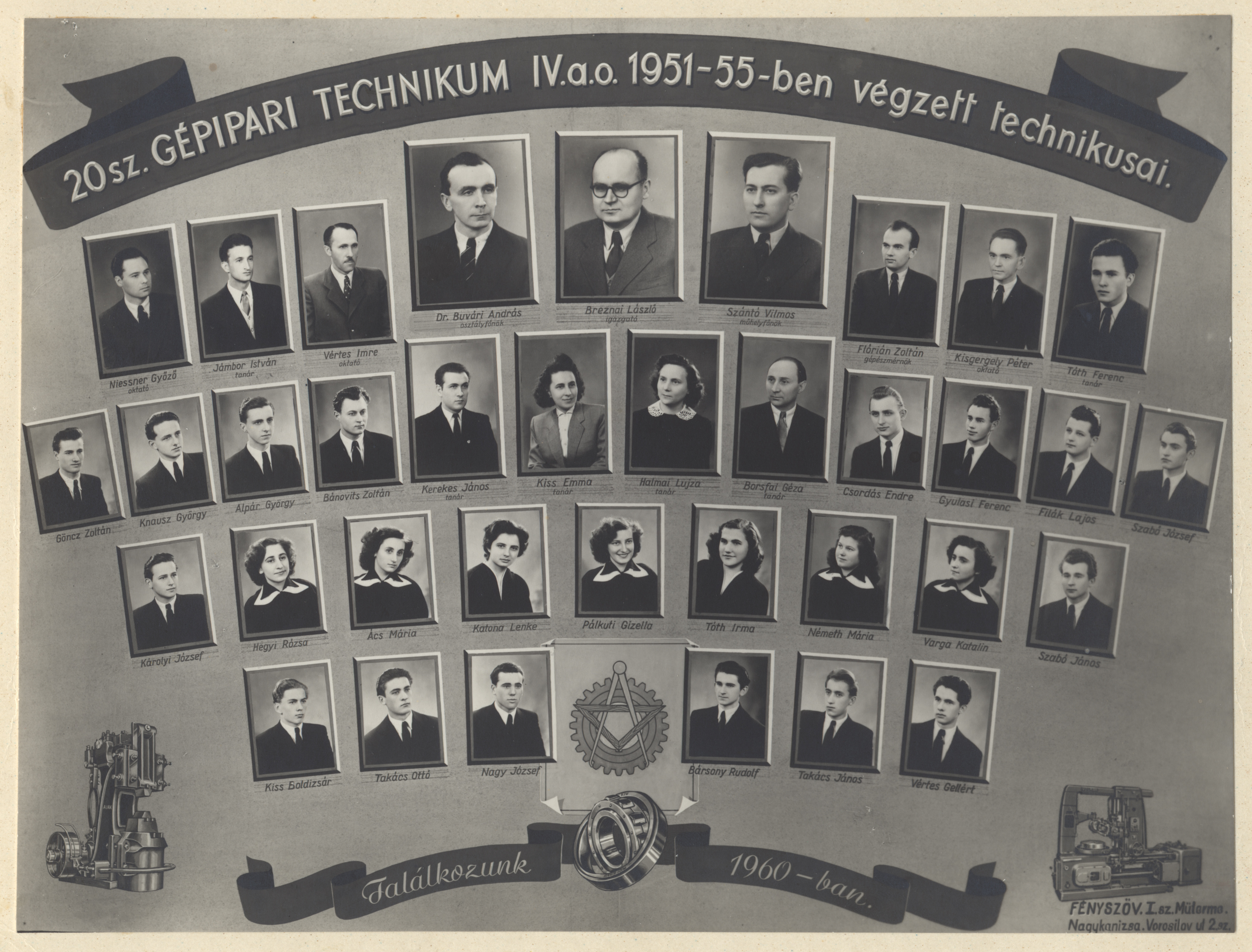 Nyilvános 1371 | 2525 | 20 sz. Gépipari Technikum IV.a.o. 1951-55-ben végzett technikusai | Borsfai Géza tanár Breznai László igazgató Buvári András dr. osztályfőnök Flórián Zoltán gépészmérnök Halmai Lujza tanár Jámbor István tanár Kerekes János tanár Kisgergely Péter oktató Kiss Emma tanár Niessner Győző oktató Szántó Vilmos műhelyfőnök Tóth Ferenc tanár Vértes Imre oktató Ács Mária Alpár György Bánovits Zoltán Bársony Rudolf Csordás Endre Filák Lajos Göncz Zoltán Gyulasi Ferenc Hegyi Rózsa Károlyi József Katona Lenke Kiss Boldizsár Knausz György Nagy József Németh Mária Pálkuti Gizella Szabó János Szabó József Takács János Takács Ottó Tóth Irma Varga Katalin Vértes Gellért |
