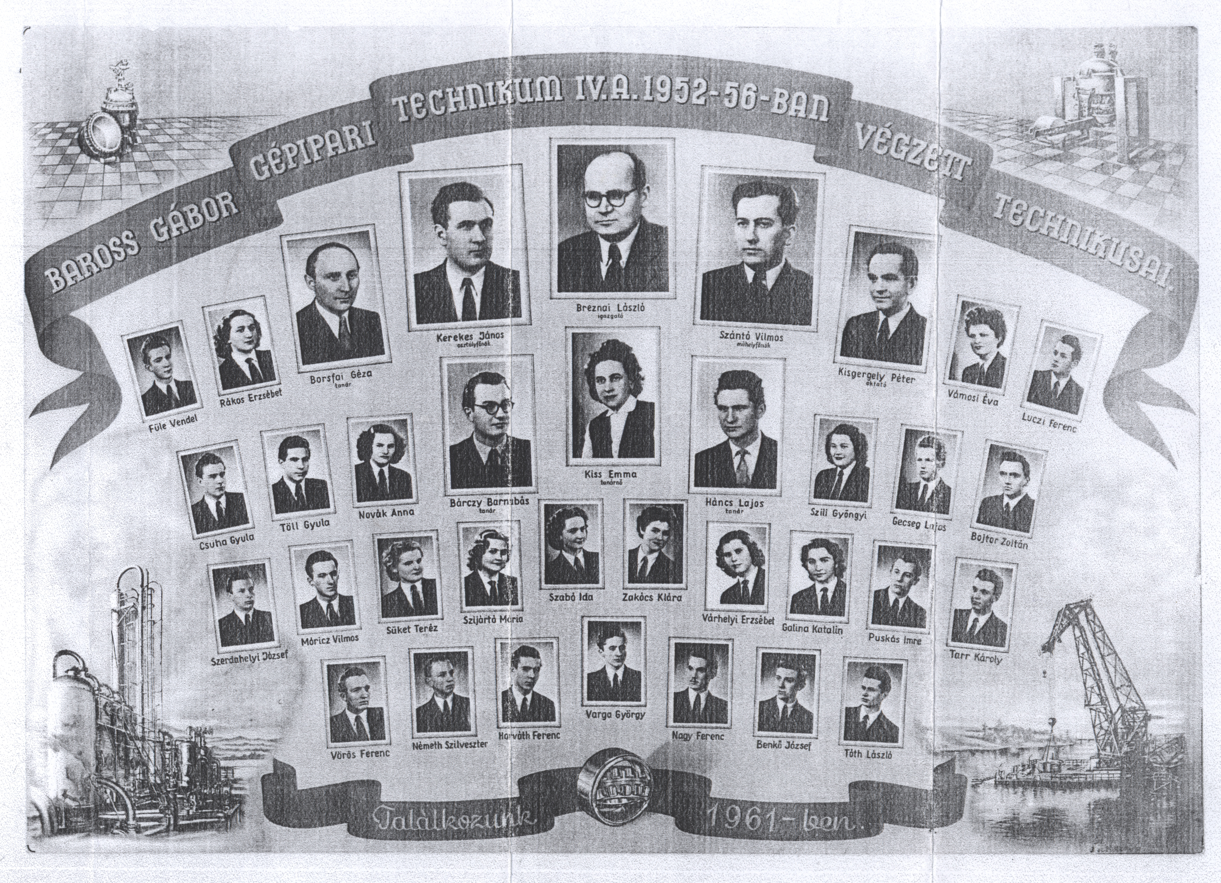 Nyilvános 1432 | 2573 | Baross Gábor Gépipari Technikum IV.A. 1952-56-ban végzett technikusai | Bárczy Barnabás tanár Borsfai Géza tanár Breznai László igazgató Háncs Lajos tanár Kerekes János osztályfőnök Kisgergely Péter oktató Kiss Emma tanárnő Szántó Vilmos műhelyfőnök Benkő József Bojtor Zoltán Csuha Gyula Füle Vendel Galina Katalin Gecseg Lajos Horváth Ferenc Luczi Ferenc Móricz Vilmos Nagy Ferenc Németh Szilveszter Novák Anna Puskás Imre Rákos Erzsébet Süket Teréz Szabó Ida Szerdahelyi József Szijártó Mária Szili Gyöngyi Tarr Károly Tóth László Töll Gyula Vámosi Éva Varga György Várhelyi Erzsébet Vörös Ferenc Zakócs Klára |